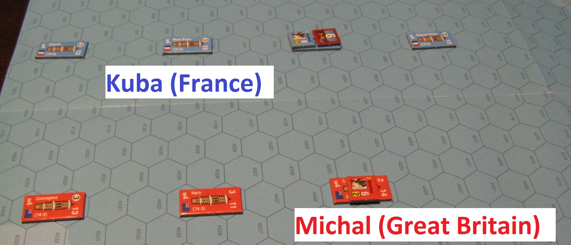 Ok, so we start with mentioned Cape Ortugal scenario, where four french ships (one damaged) are escaping from Trafalgar (Kuba). They are being pursued by three British ships (Michal) and, historically, all french ones will be captured.
