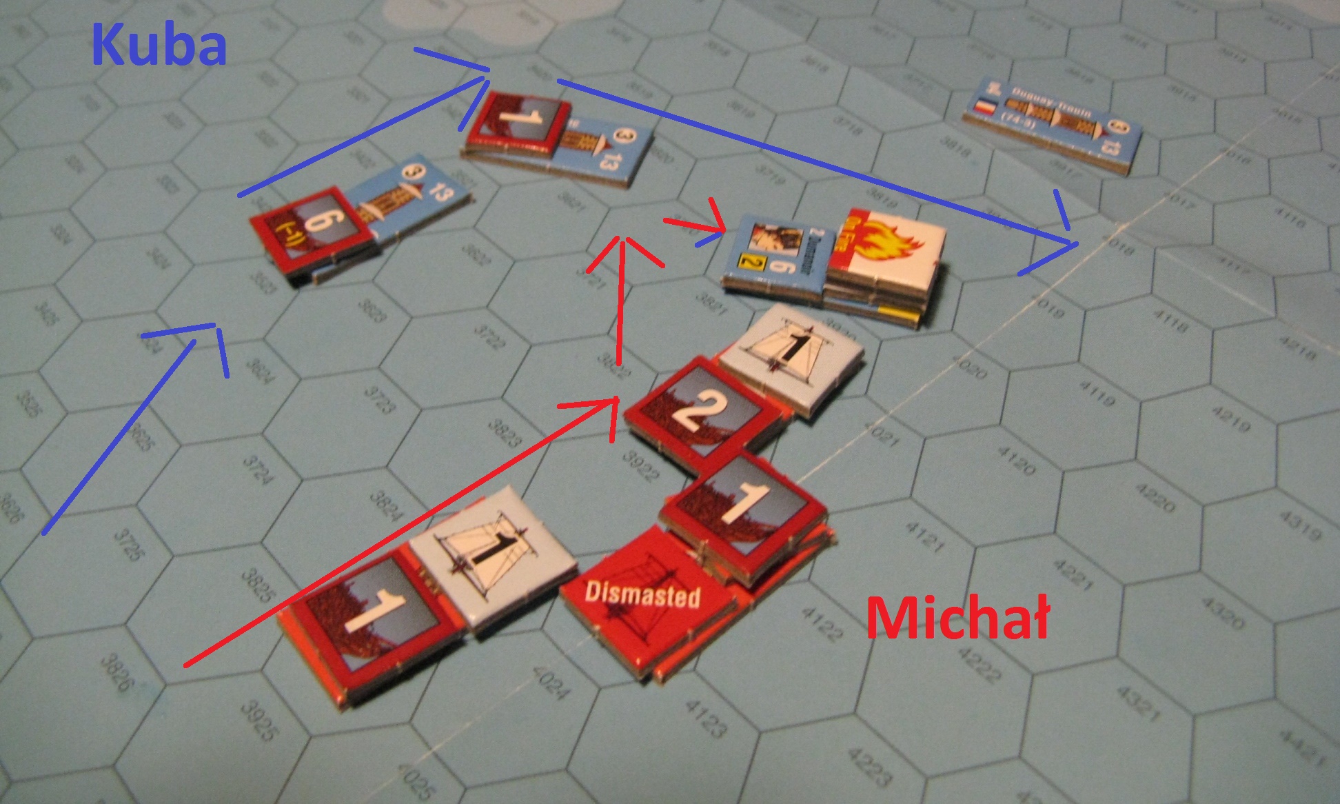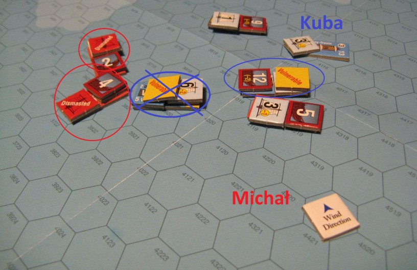 In the end, maneuvering started – Kuba started to turn against wind, while I tried to intercept his move. The game really well depicts and simulates wind influence on movement: