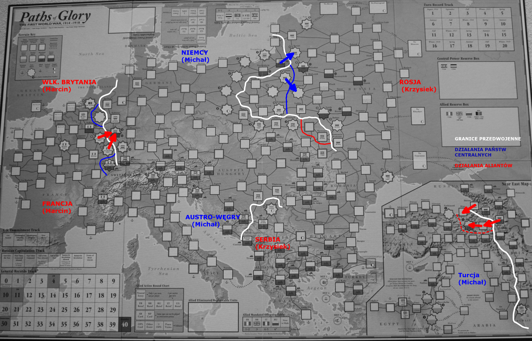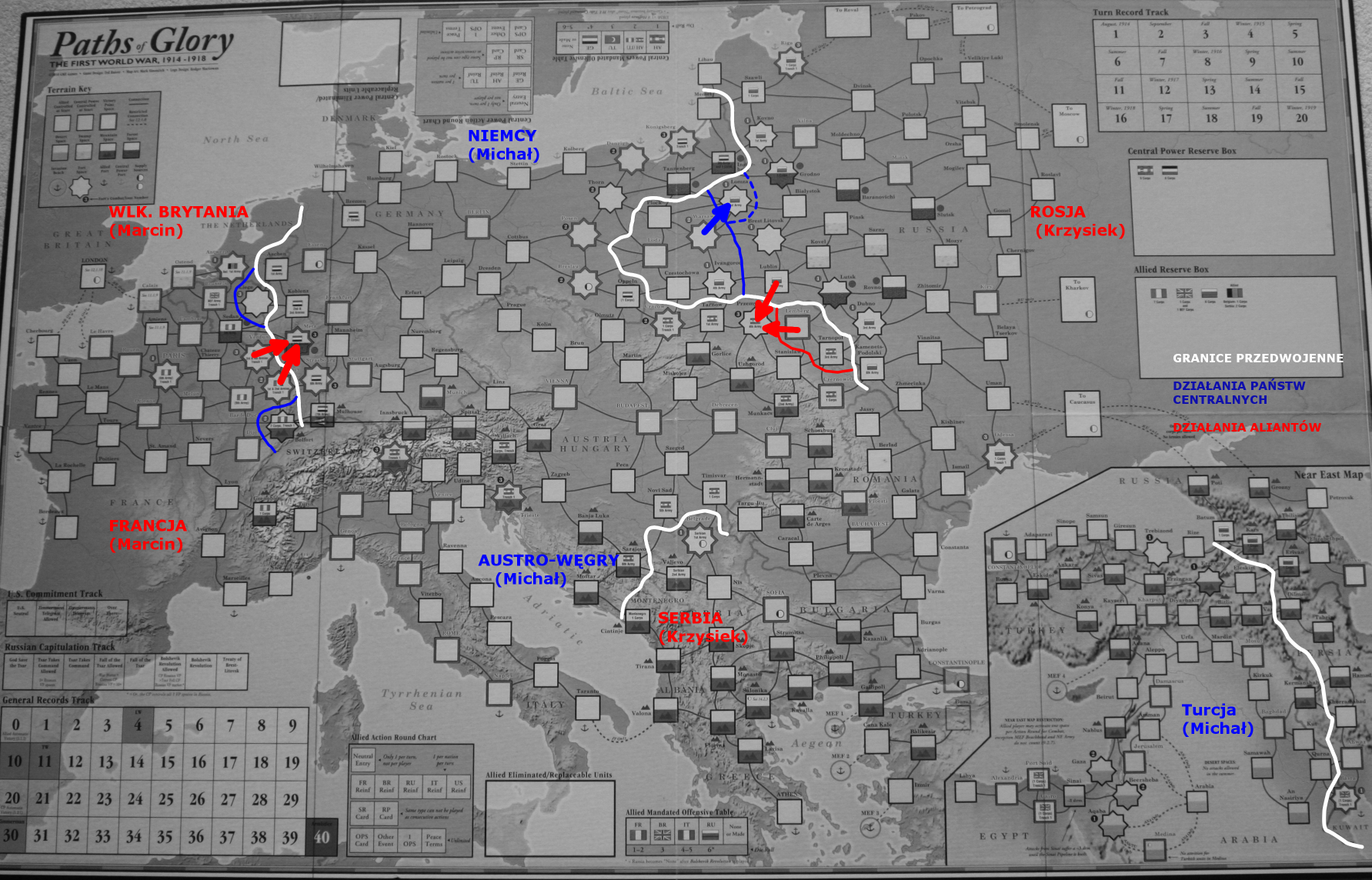 This time we decided to start a 3-player game – with me being the Central Powers, Krzysztof Eastern Allies and Marcin Western Allies. We resigned from that variant restrictions, where Allies can play a card only for one front – that gave our new player much more flexibility. And of course, it was training experience and the main purpose to have a lot of fun! So, let us plunge into the session report and see what happened!