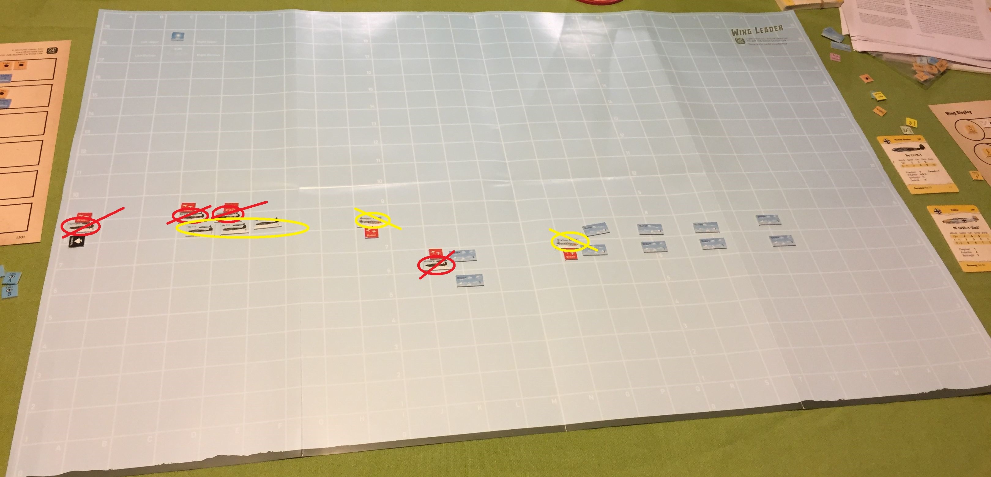 After prolonged break, we again had time to play the great simulation of aerial fights during WWII – The Wing Leader. This time we played Scenario 4, which took place during the Battle of Britain and is describing one of the raids undertook by German bombers (yellow circles, Kuba) against the surprised coastal defenses of Great Britain (red planes, Michal).