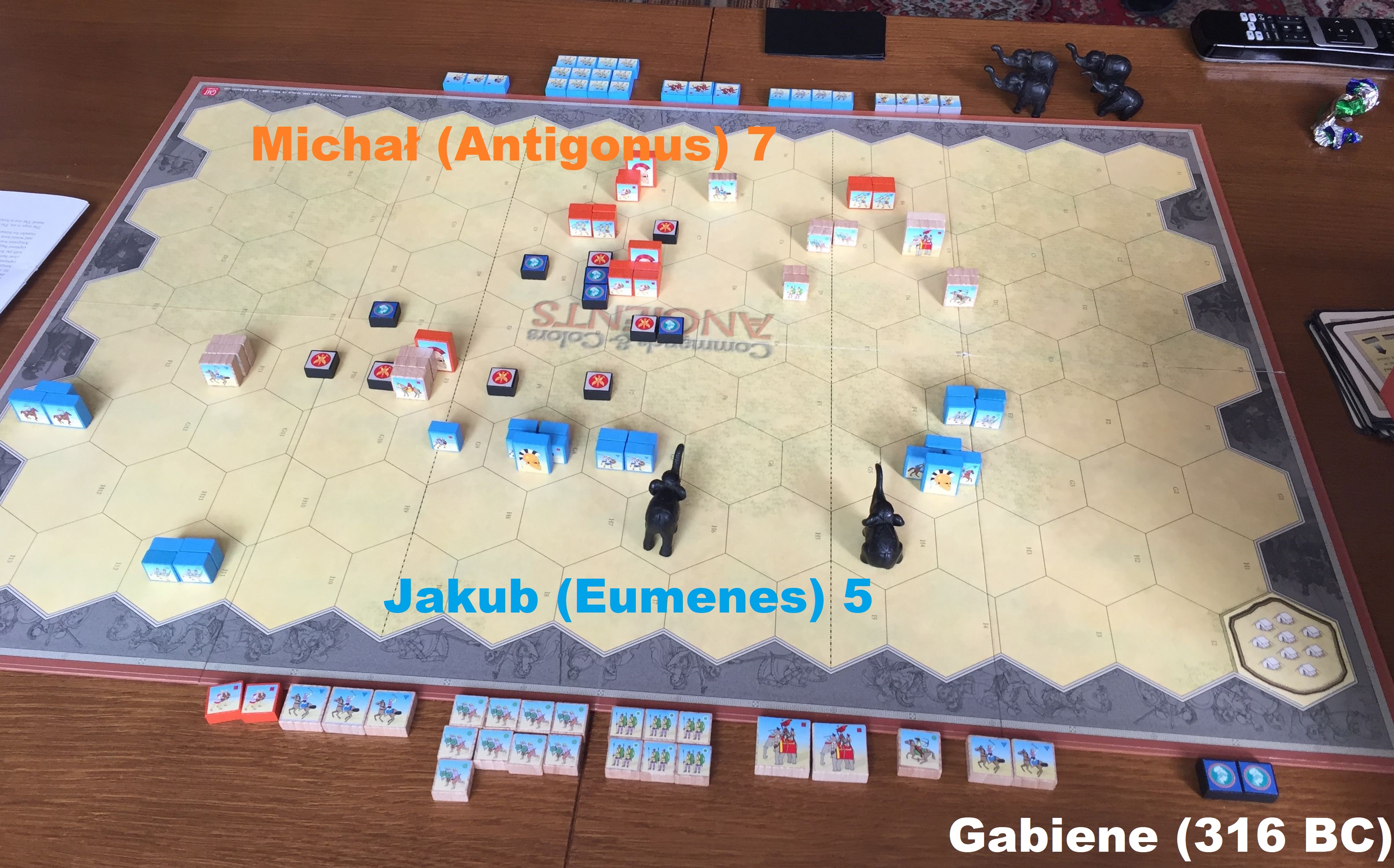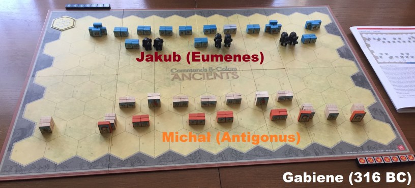 Kontynuowaliśmy kampanię sukcesorów Aleksandra Wielkiego. Zagraliśmy drugie starcie między głównymi pretendentami – Antigonusem (ja) i Eumenesem (Kubek). Sama bitwa historycznie znów kończy się remisem (tak jak Paraitacene rok wcześniej), ale kawaleria Antigonusa zdobywa tabor Eumenesa. Jest to też tabor najbardziej elitarnej jednostki Aleksandra – tzw. Silver Shields – walczących pod dowództwem Eumenesa. W tym momencie Antigonus wymienia zdobyty tabor na Eumenesa, którego wydają Silver Shields. Zakończenie jest smutne: Eumenes ginie z rąk Antigonusa, a Silver Shileds zostają rozwiązani i rozproszeni po garnizonach granicznych państwa Antigonusa, nigdy nie wracając do domu (Macedonia). Antigonus dobrze wiedział, że są zbyt groźni, będąc w stanie obalać nawet władców (jak wydanie Eumenesa za tabor).