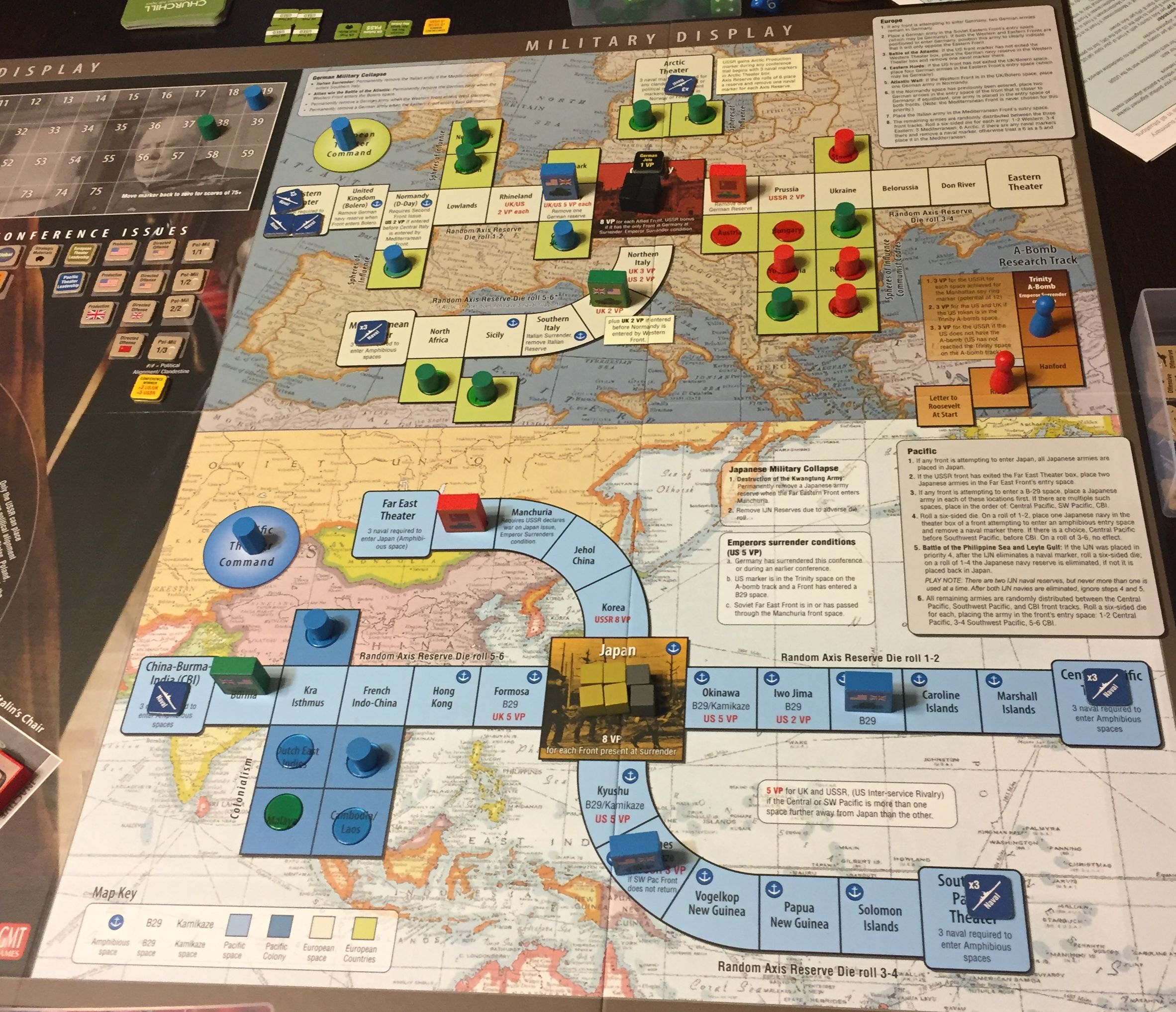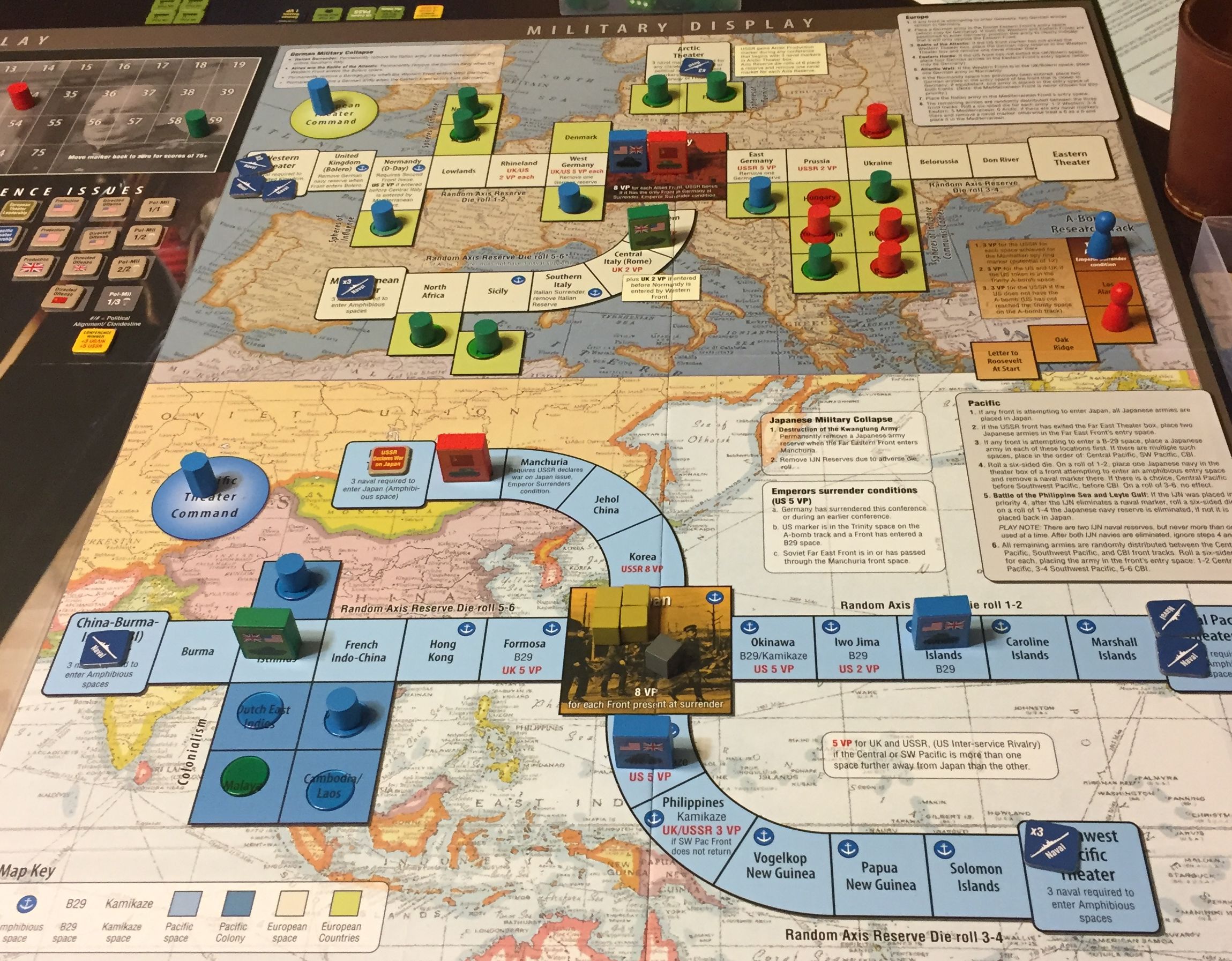 - Politycznie nie ma jakiegoś trzęsienia ziemi tym razem, ale ZSRR przystępuje do wojny z Japonia. Prawie wchodzi do Mandżurii… było 30% na to na kostce, a gdyby do tego doszło bomba atomowa spadła by na Japonię i gra się skończyła