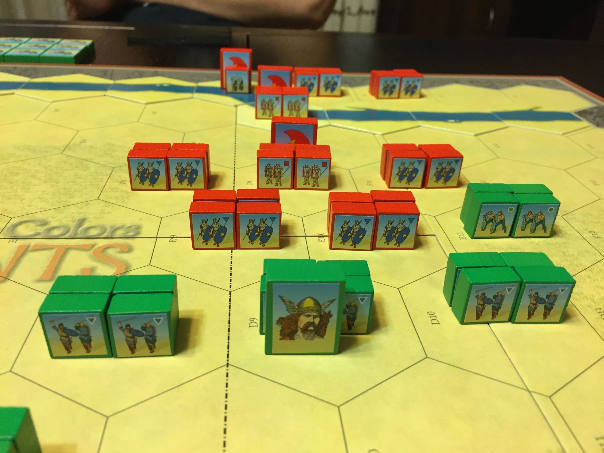 Ale oczywiście na początek, zanim zagraliśmy z naszymi turniejowymi przeciwnikami, rozegraliśmy miedzy sobą próbny mecz i rewanż. Tematem tej rundy była inwazja na Wielka Brytanie podczas panowania Cezara Klaudiusza i bitwa pod Medway. Po lewej na górze widać oddziały pomocnicze Rzymu – Batawów, które spokojnie przeszły rzekę. Po prawej – przechodzące przez most pontonowy dwa legion pod dowództwem generała Wespazjana (za 20 lat będzie cesarzem, i to jednym z najlepszych). Cały trik polega na tym aby przetrwać Batawami dopóki legiony nie przyjdą z pomocą: