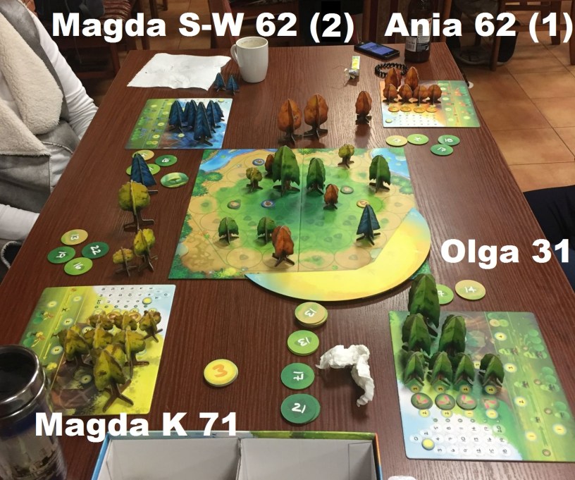 Na wieczór Magda K przygotowała nowy system zapisów na gry – kartka, flamaster i konkretna oferta planszowa. W tym systemie zaprezentowała przepiękny nabytek – zapoznany w Essen – czyli Fotosyntezę. Doszło do wyrównanej walki, a o drugim miejscu decydowała ilość drzewek na planszy na koniec gry: