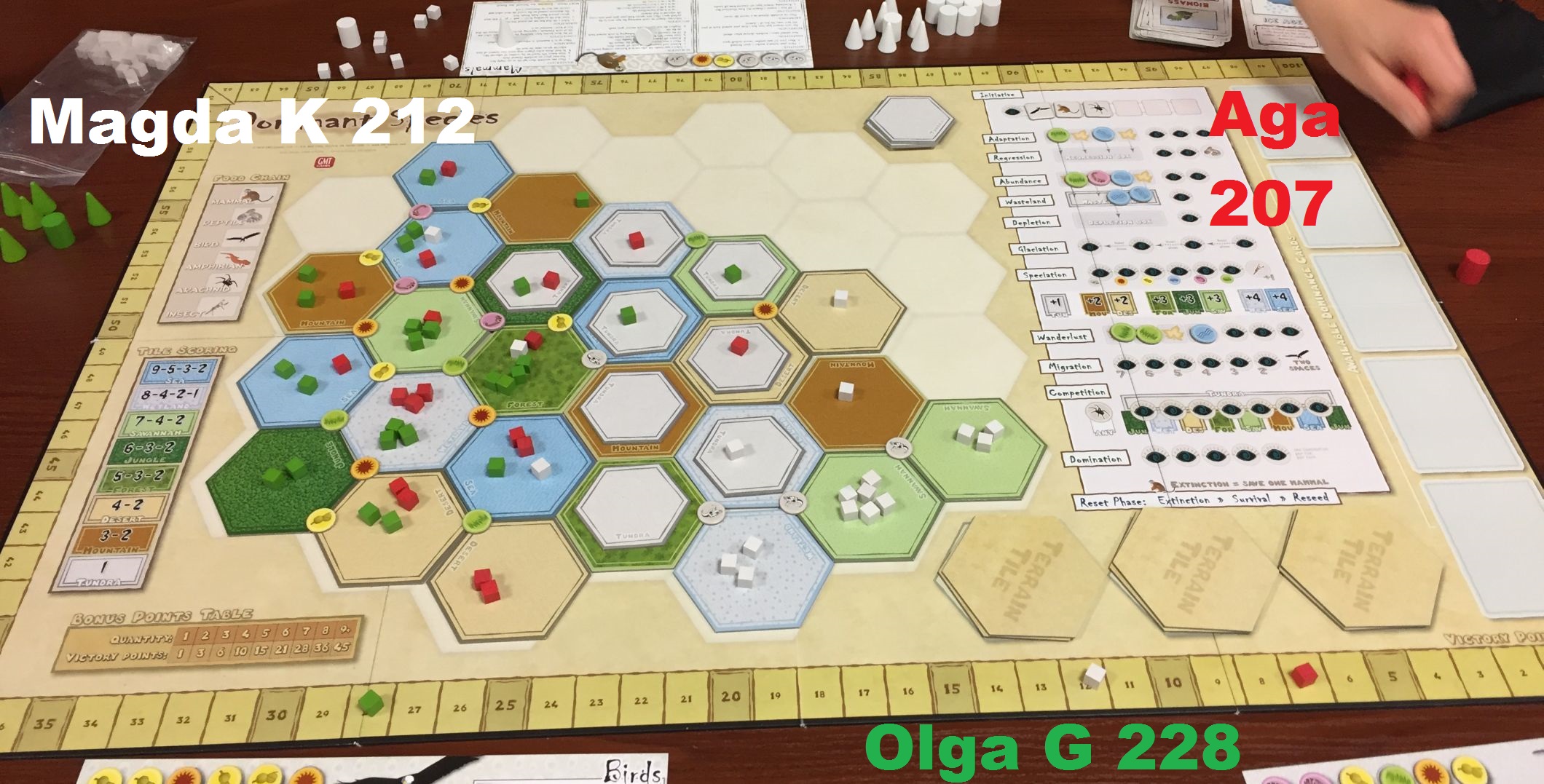 Dziewczyny były bezwzględne a gatunki – bardzo sprawnie – ginęły całymi dziesiątkami. Piękny finisz wykorzystując kartę Dominacji wykonała Olga, zdobywając kilkadziesiąt punktów zwycięstwa w ostatniej turze i pierwsze miejsce w całej grze: