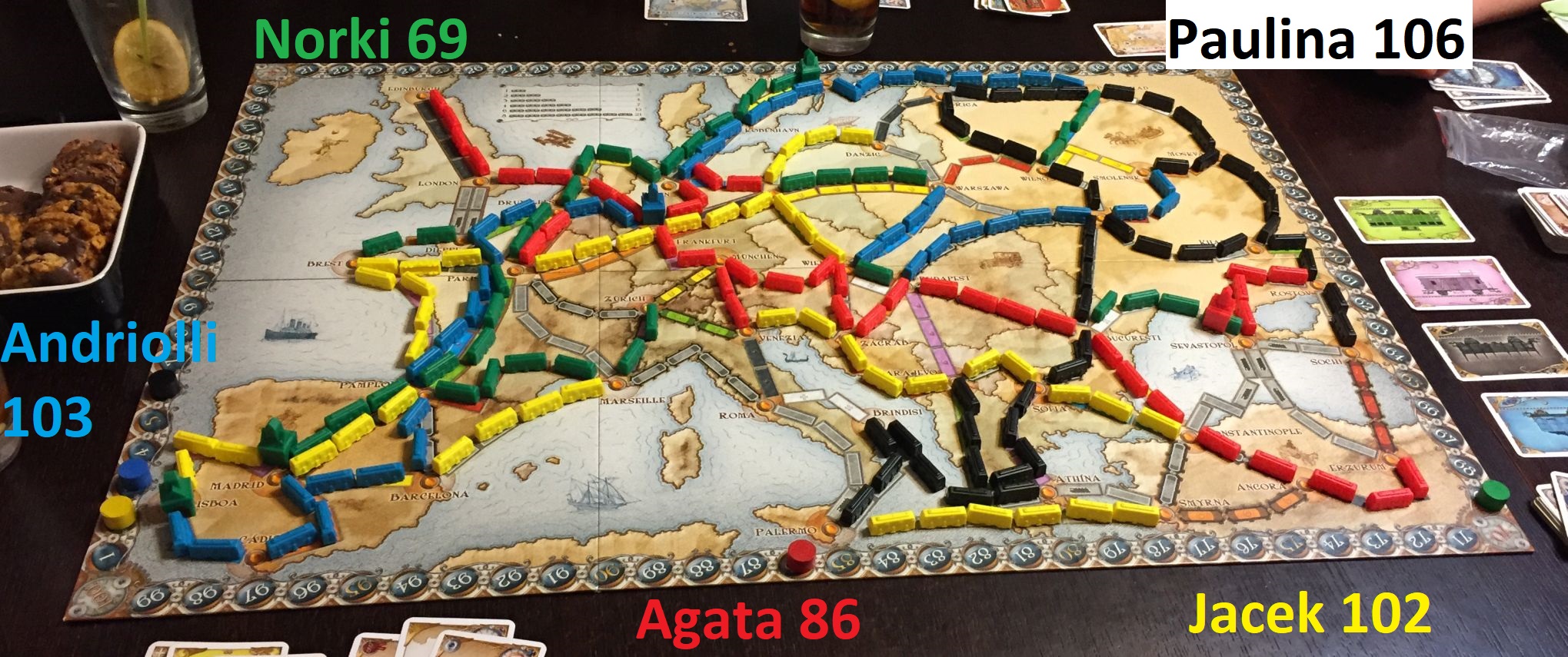 Gośka z Łukaszem stworzyła zespół pod roboczą nazwą “Norki”, Konrad został przemianowany na Andriollego i się zaczęło. Z pamiętnych wydarzeń, które odnotowała historia to wielokrotne próby zbudowania tunelu “różowymi wagonikami” przez Paulinę, super długie tunele Andriollego, debatę czy jeżeli są dwa Norki to punkty końcowe podzielić im na dwa, świetny finisz punktowy Jacka i Agatę prowadzącą na punkty przed rozliczeniem biletów – były zakusy, aby grę w tym momencie skończyć “bo wynik był już satysfakcjonujący” 🙂