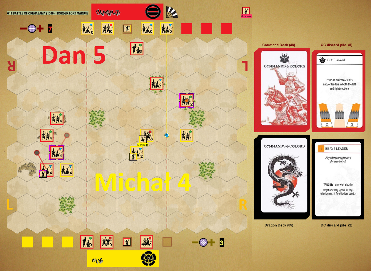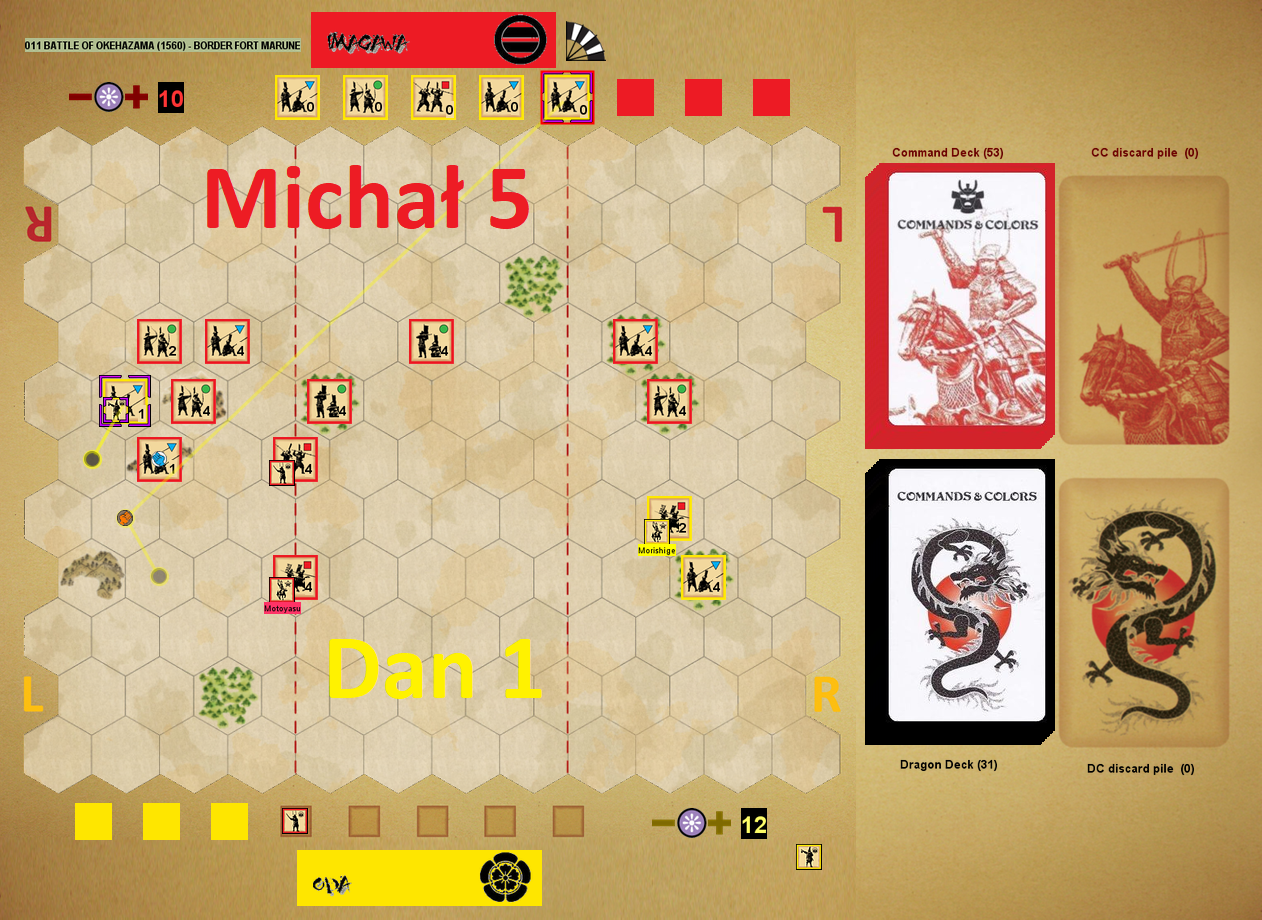 Mi się udało zapoznać z tą pozycją dzięki kolejnemu (piątemu) z mini-turniejów Samurai Battles. Grało nas tylko czterech, ale pozostali zawodnicy – Mark, Brent i Dan – to wieloletni wyjadacze, z setkami gier w tym systemie. Przy tak małej liczbie graczy zaplanowaliśmy za każdym razem mecz i rewanż, zmieniając strony oczywiście. Po 6 meczach zliczaliśmy punkty i osoba z największą ilością wygrywała turniej. Oczywiście, używaliśmy modułu Vassal – przykład jednej z bitew poniżej: