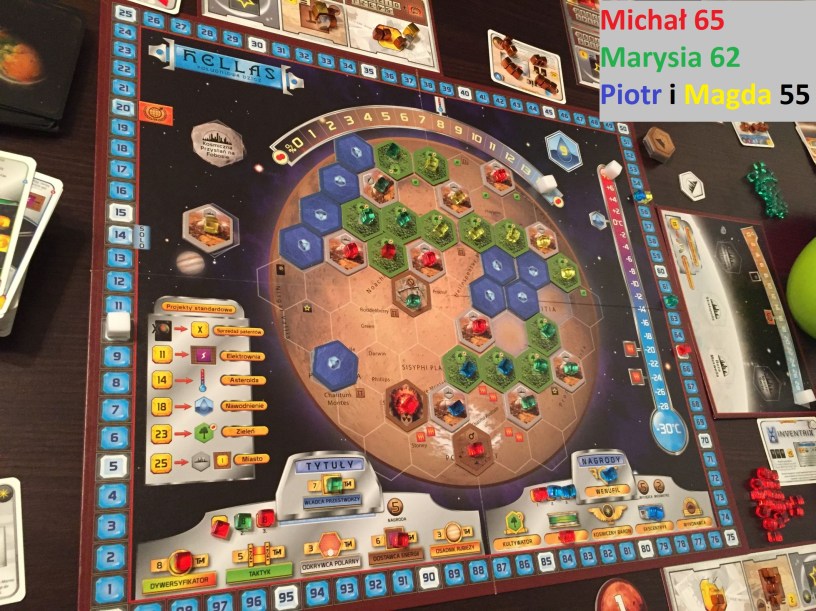 Tym razem wykorzystaliśmy planszę z rozszerzenia Hellas, dodatek Wenus (nowa, mini-plansza) i korporacje wenusjańskie. Tak się ciekawie złożyło, że Marysia i Piotrek miała swoje firmy z Wenus, a ja i Magda z Marsa 🙂 Ogólnie, prowadzone przez nas korporacje nie wymiatały i trzeba było się skupić na podstawowej mechanice aby osiągnąć sukces.