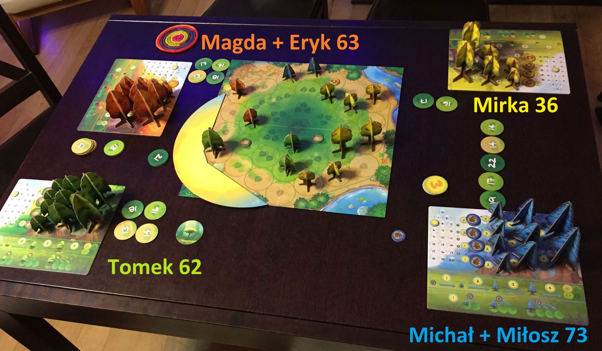 Zaraz po przyjeździe gości i “rytualnej” kawie/herbacie zasiedliśmy do Fotosyntezy. Jest to gra na 4 osoby, więc w dwóch przypadkach graliśmy w parach – ja z Miłoszem a Magda z Erykiem. Sama rozgrywka sprawiła wszystkim dużo frajdy – ta pozycja jest pięknie wydana i zdecydowanie nadaje się dla początkujących adeptów tego hobby – chociaż trywialna też nie jest. Po zażartej walce – zwłaszcza w ostatnich kilku rundach – najlepszym leśnikiem/drwalem okazał się mój duet z Miłoszem: