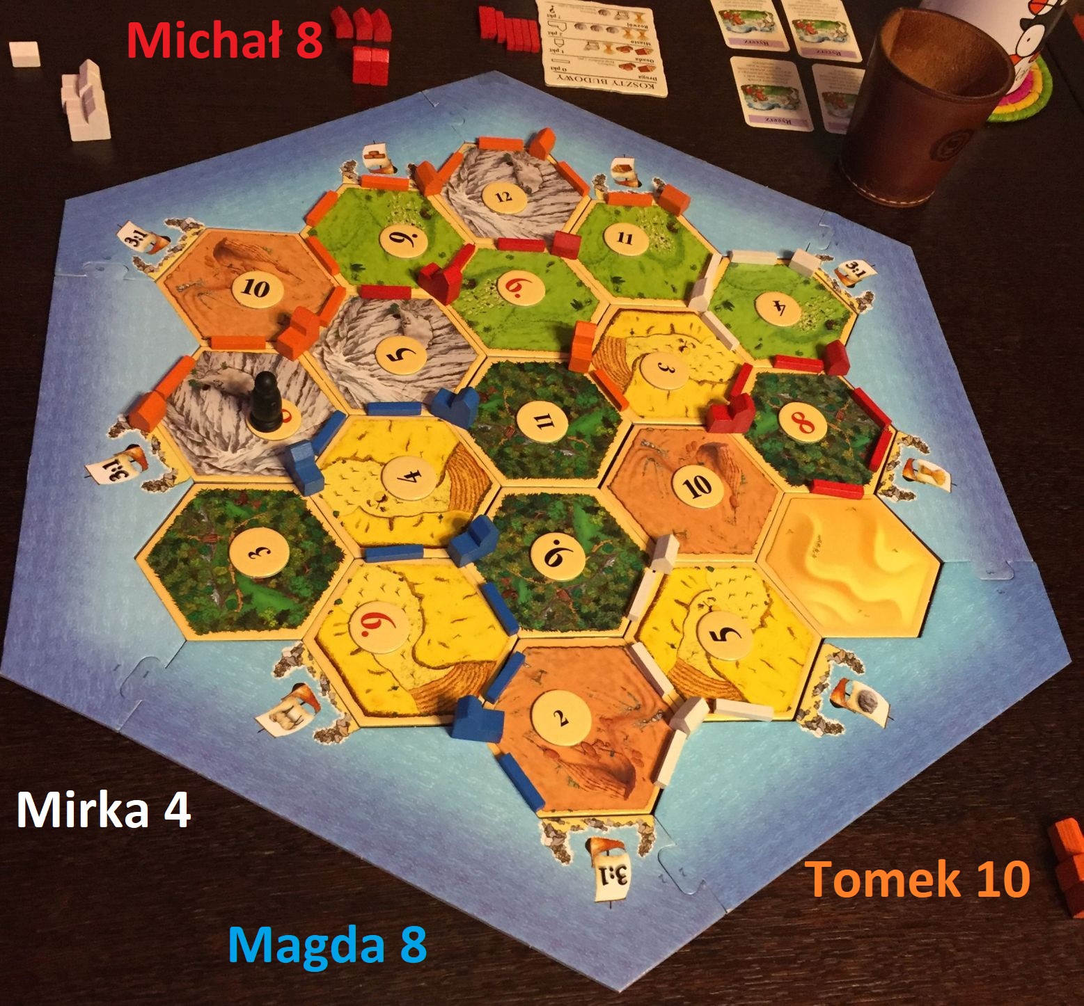 Powrót do Osadników był bardzo odświeżający i miły. To naprawdę sympatyczna gra – szczególnie podoba mi się olbrzymia ilość interakcji między graczami i element “suspensu” przy rzucie kostką – “a może w końcu moje pole wypadnie!” I tutaj zabłysną Tomek – zbudował najdłuższa drogę, liczne porty i silna gospodarkę. Mój i Magdy pościg się nie udał a Mirka niestety nie mała dobrych lokalizacji aby się rozwinąć..