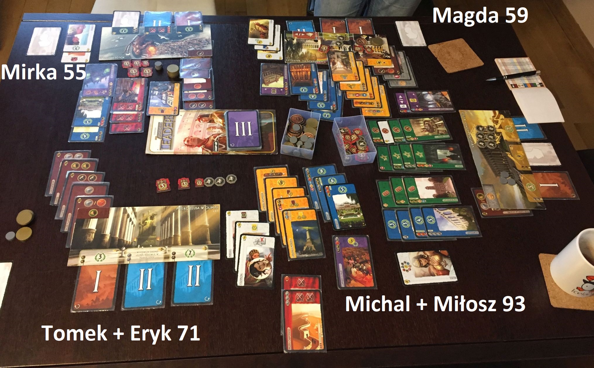 Rodzinne spotkanie pora zakończyć, ale… nie tak szybko! Musi być przecież “planszowy rozchodniaczek” – padło na dawno nie grane Cuda. Dodaliśmy Liderów aby zwiększyć poziom zaawansowania / skomplikowania rozgrywki i do przodu. Mieliśmy podobne ustawienie jak w Fotosyntezie – dwa duety i dwóch graczy indywidualnie. Mirka poszła ostro w militaria, Magda w handel i kulturę, a Tomek z Erykiem w produkcję. Nasza spółka z Miłoszem zainwestowała w naukę – co było bardzo opłacalne, bo dając nam z tego tylko źródła 62 punkty pozwoliło osiągnąć oszałamiający wynik 93 punktów: