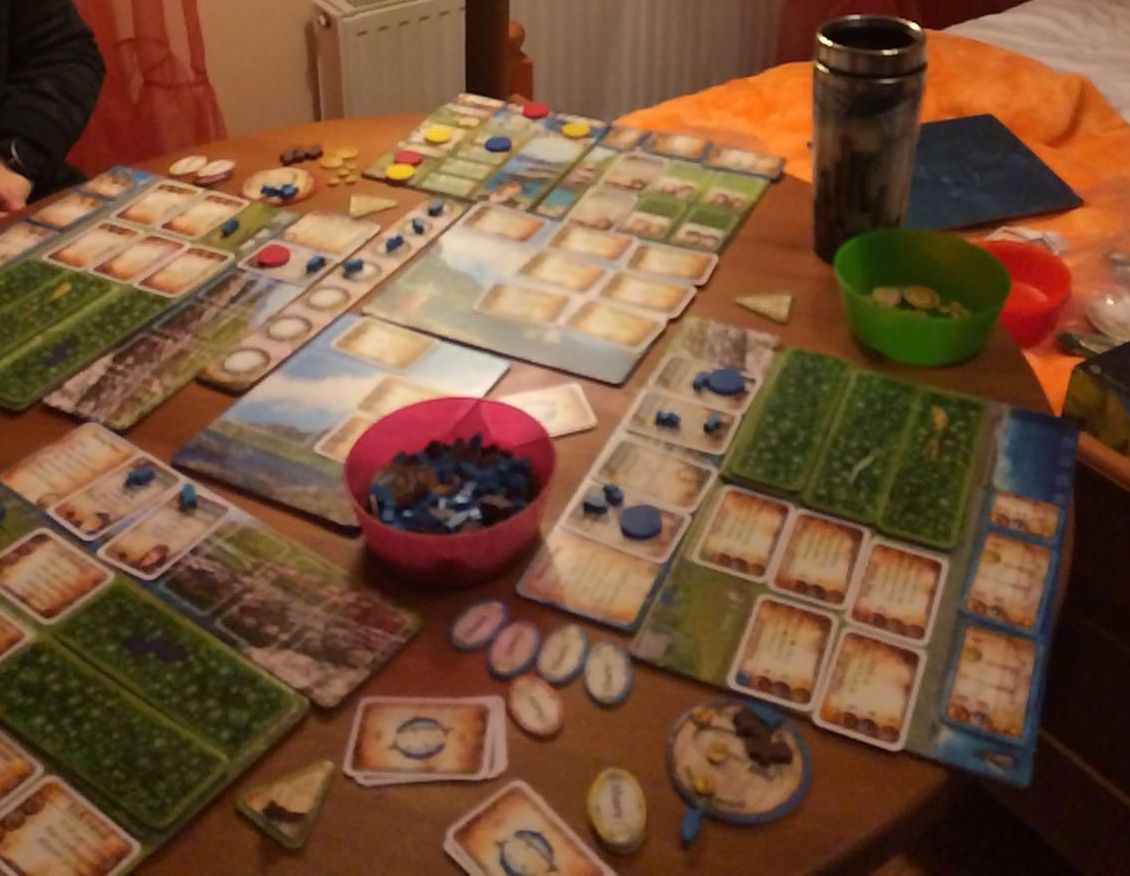 Podzieliliśmy się w miarę tradycyjnie na „stolik męski” i „stolik żeński”. Jako, że zaczynaliśmy dosyć późno (okolice 23) to raczej zdecydowaliśmy się na znane tytuły, gdzie nie było konieczności długiego tłumaczenia. W wypadku naszej rozgrywki było to „nasze Morze” – ostatnio często grana pozycji (patrz: pierwszy i drugi Uniejów 2017: opisane tu i tu). Dodatkowo, aby wygospodarować miejsce na rozgrywkę, z górnego piętra do jednego z pokoi został sprowadzony specjalny, zabytkowy stolik 🙂