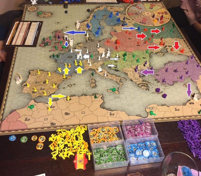 - Kuba (Polska) zaatakował zdecydowanie Rosję, i po dwóch turach zmiótł Moskwę. Szczęśliwe karty Informacji Państwowych pozwoliły mu na dodatkowe ataki dzięki czemu zaszedł naprawdę daleko. Jednocześnie przejął Krym i zamknął drogę na północ Ottomanom Piotrka