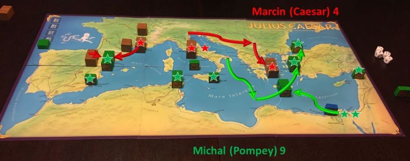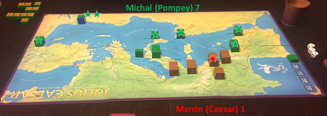 I admit, that was surprisingly fast but it definitely underlines strategic importance of Greece, the race to take three victory pints there and possibility to hold them against all odds. Unfortunately, for Caesar (Marcin) his legions were pretty slow and in decisive battle – gave way the ground to Pompey The Great 🙂