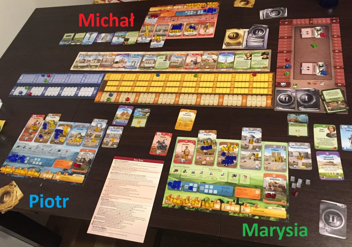 Z powodów dosyć późnego startu – dopiero o 22 – jak i kataru Maćka, udało się nam zagrać tylko do połowy II ery. Ale ewidentnie “nowi adepci” Through the Ages załapali bakcyla, bo gra bardzo się spodobała i już jesteśmy umówieni na rewanż, gdzie zagramy do końca i w pełnym składzie!