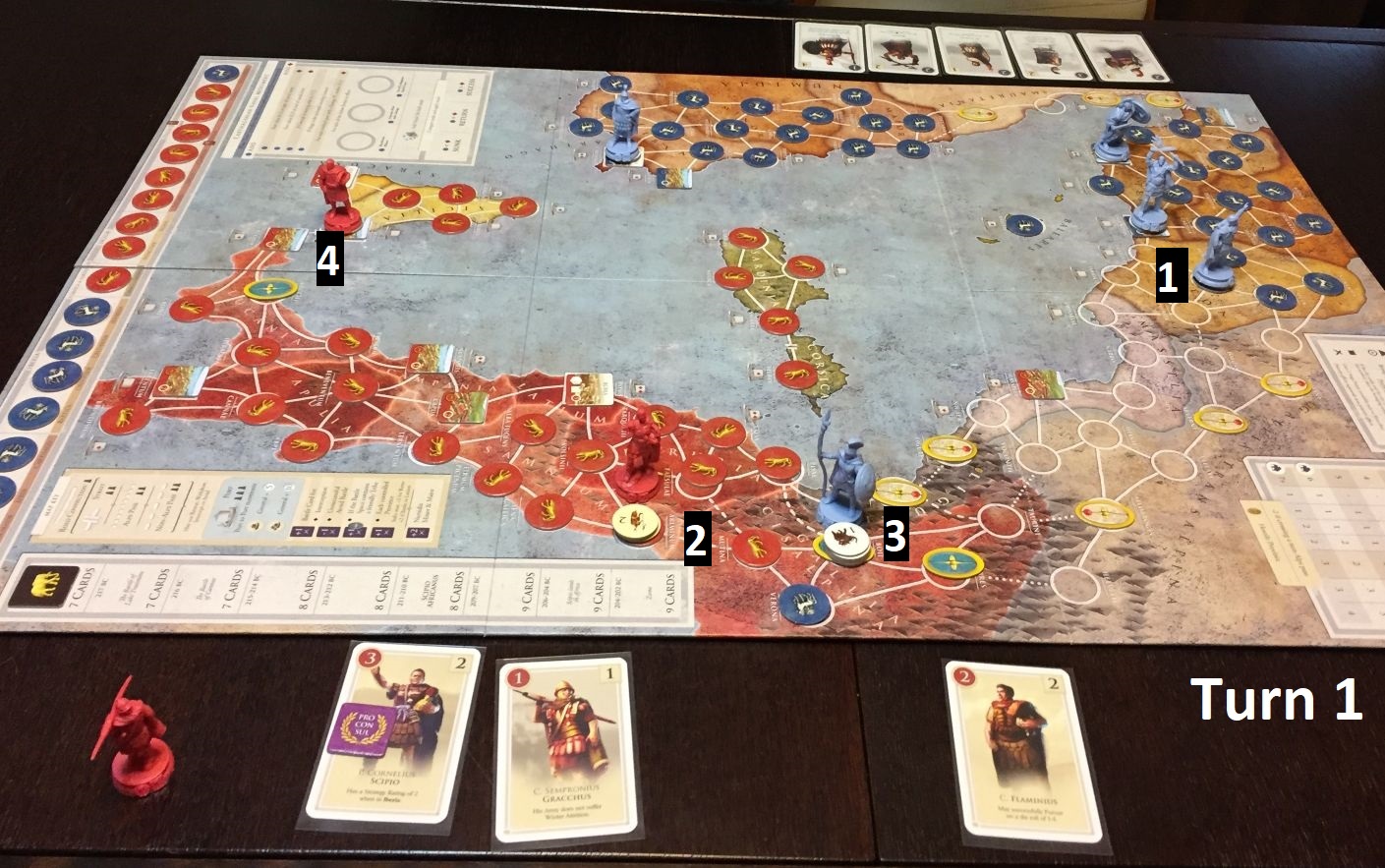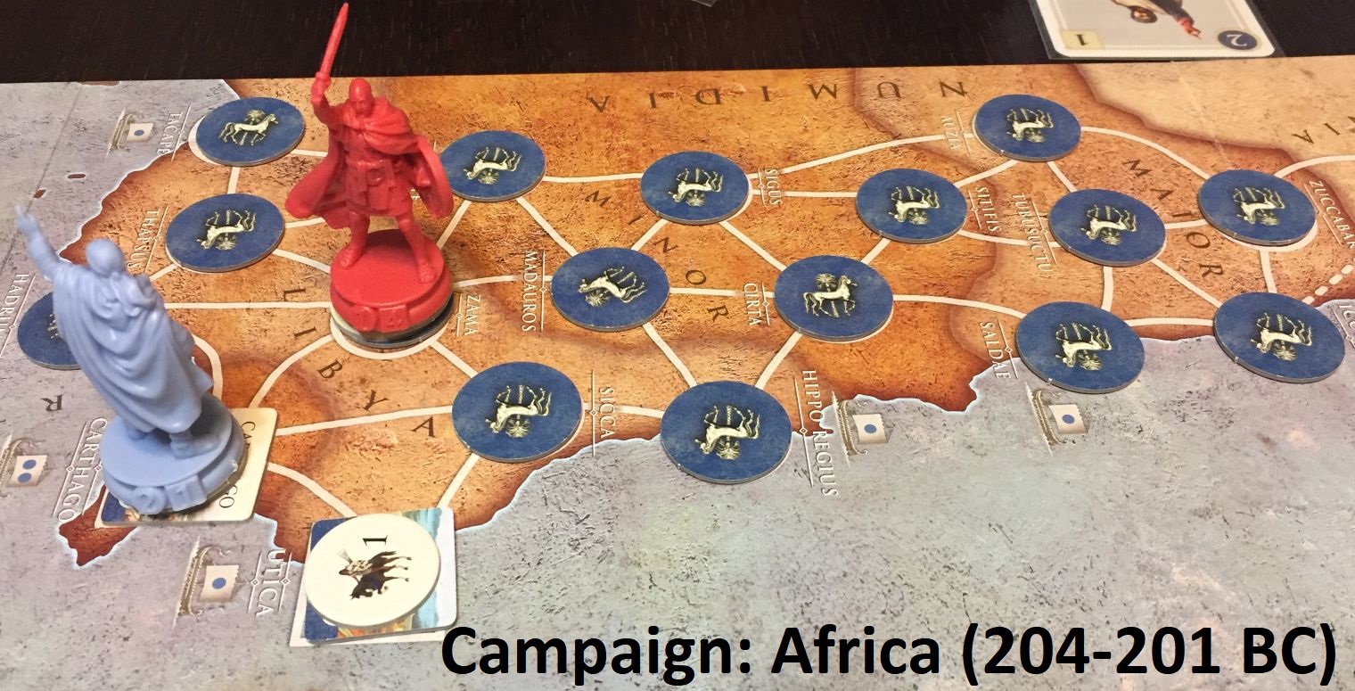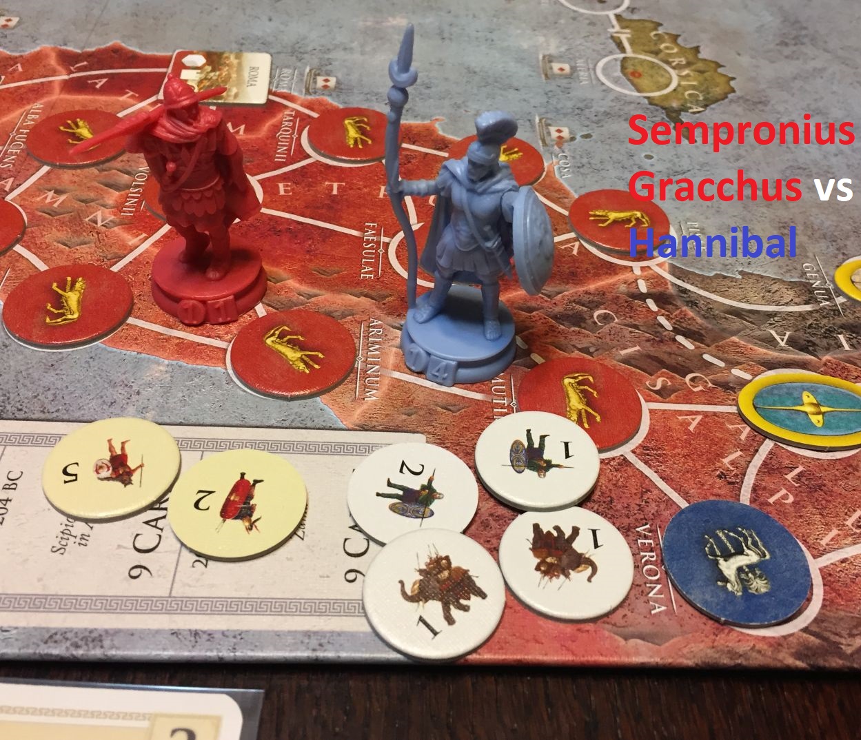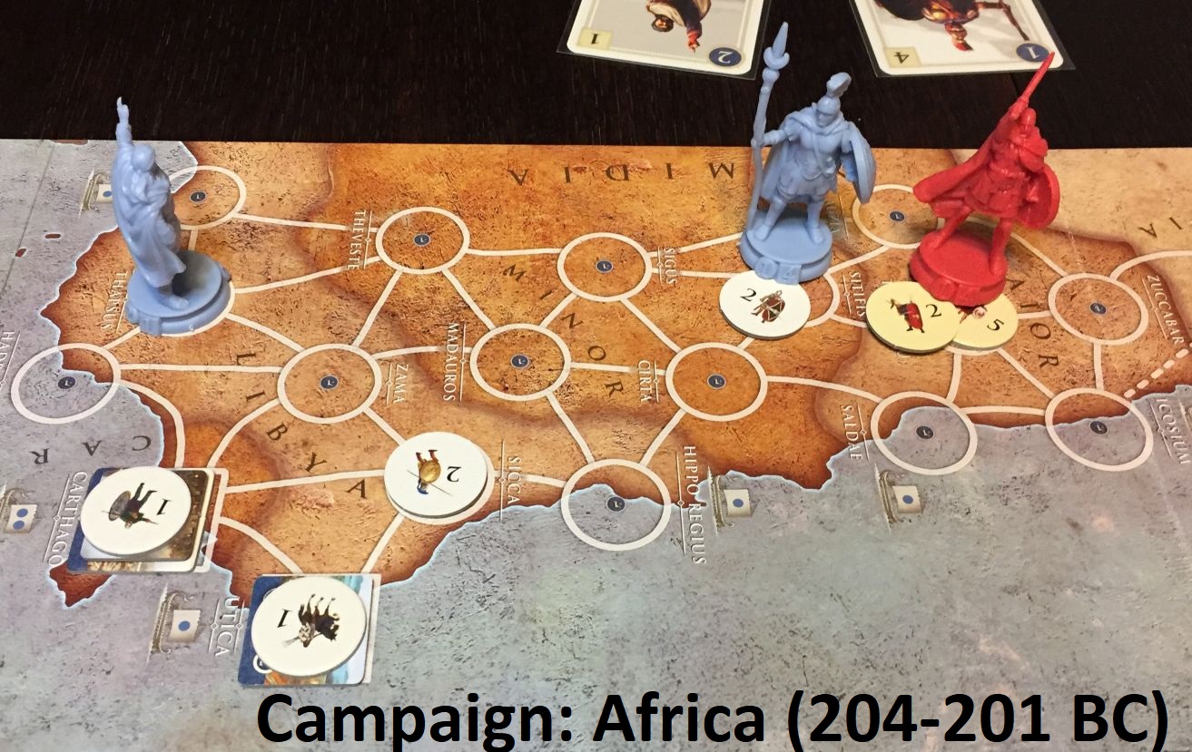 This is tough for Carthage not because of military advantage of Rome, but because of political consequences of actions – you can see blue tokens of Carthage control – when they are all gone, Rome wins…