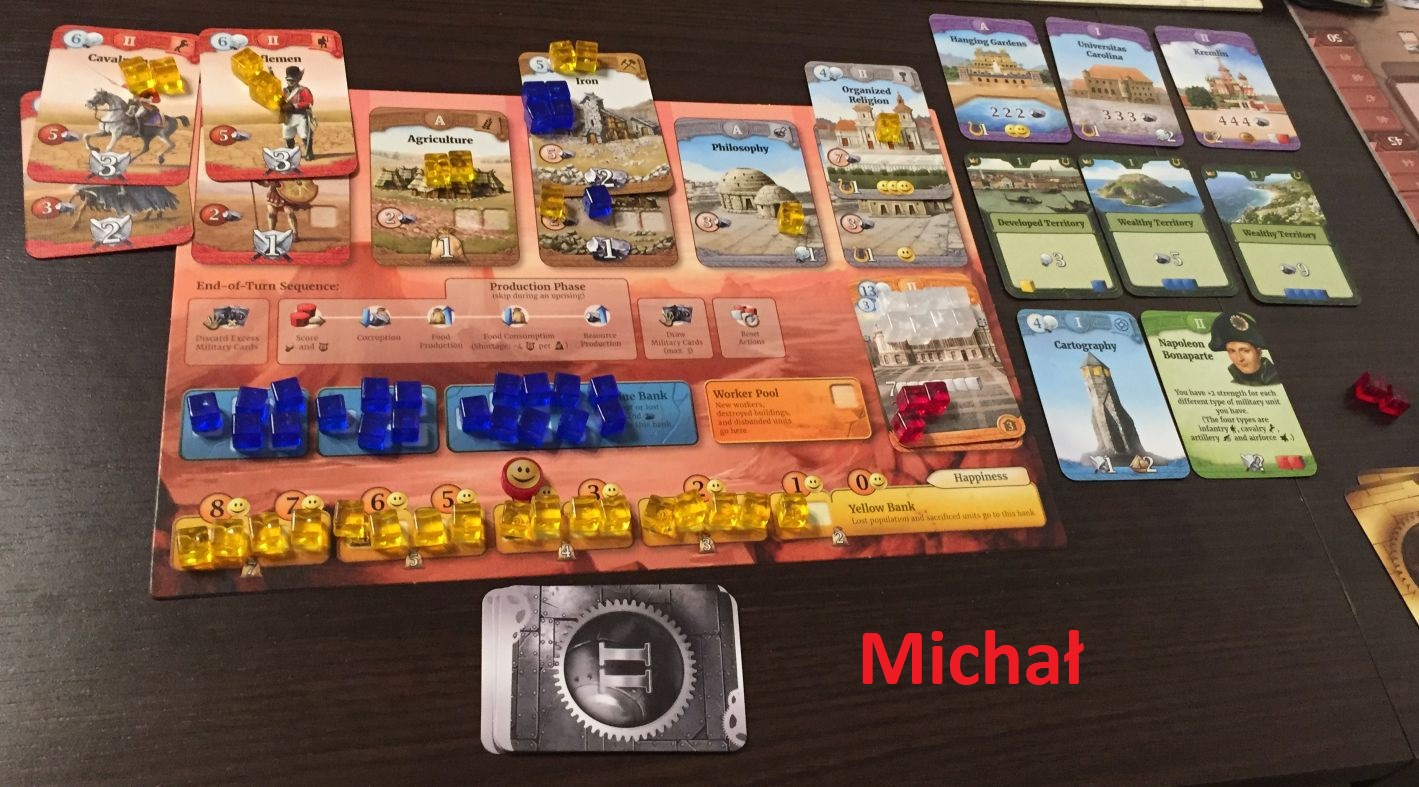 Co do mnie, było to dużo koloni dzięki czemu miałem pełno niebieskich i żółtych znaczników, trzy cuda świata a pod koniec inwestycje militarne – wojsko i Napoleona: