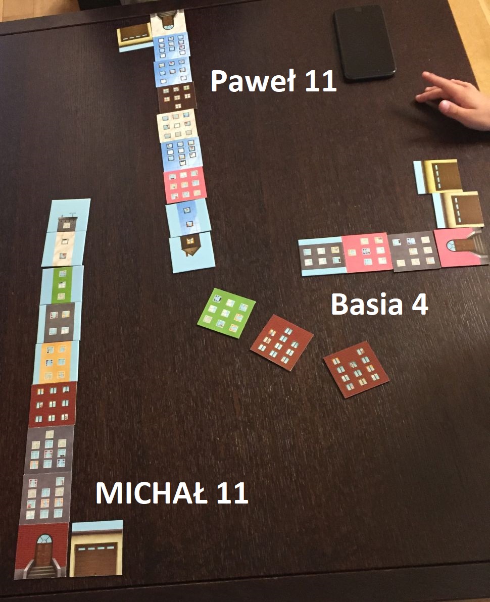 Na pierwszy ogień poszła szybka, zwinna i emocjonująca planszówka, w której musiałem stawić czoła Pawłowi i Basi. Oj było dużo hałasu, liczenia, układania – Basia niestety miała pewien przestój, który został zdecydowanie wykorzystany przez Pawła: