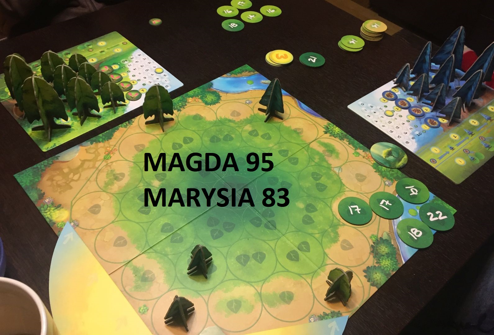 Dziewczyny następnie zasiadły do naszego kolejnego nabytku inspirowanego targami w Essen. Tutaj zdecydowanie górowało doświadczenie Magdy nad Marysią – chociaż wynik nie był bardzo zróżnicowany. A dodatkowo dziewczyny wycięły prawie całą planszę: