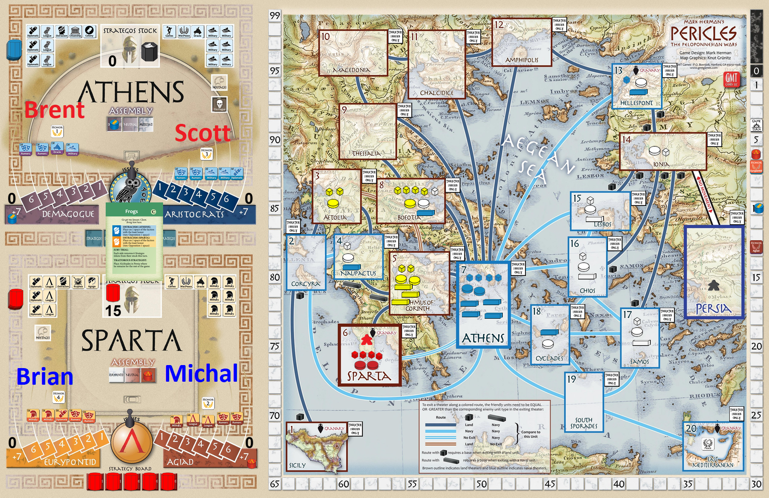 The assembly phases are again won by Agaids (me) and Demagogues (Brent) but very important development occurs – due to the negotiations, and – apparent – lack of agreement – Athens will enter the Theater phase with only four “real issues” (I do not count rumors) while Sparta will have eight, including four military. Sounds like interesting turn!