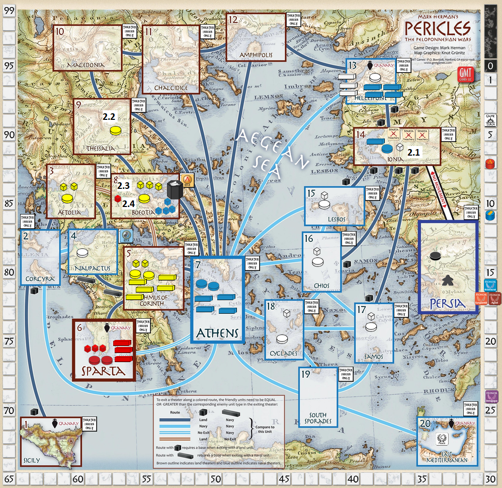 It is not always easy to find fellow Pericles players – especially for live game, so in such circumstances Internet is of great assistance. And here Vassal and its modules are one of best to use. Having this in mind, I joined Play By Email game organized by Brent – we actually used a Dropbox for storing the saves, and ACTS for communication. Worked very well!