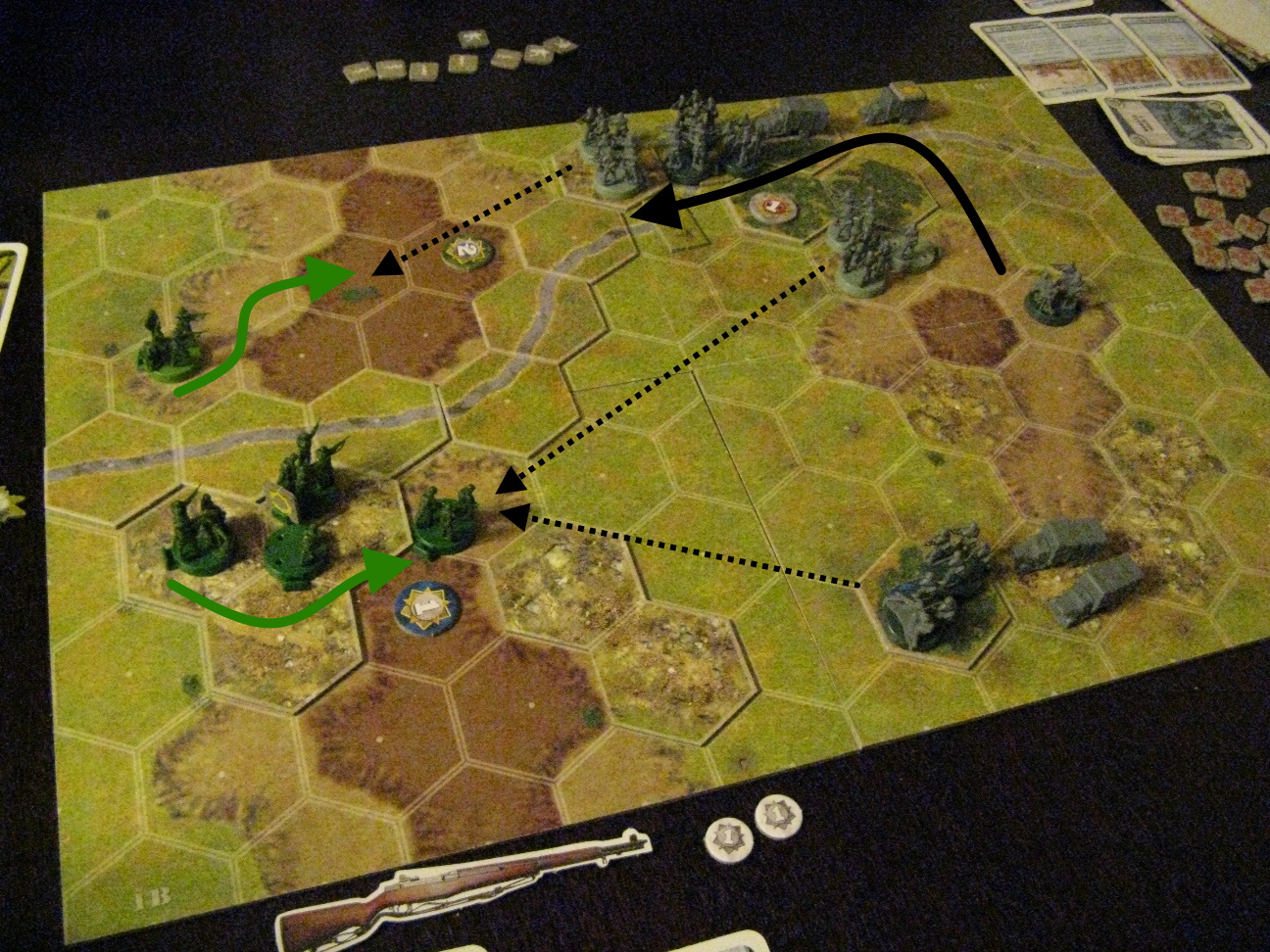 The third turn was both Americans digging in at one place, and desperate attack on the other side of the map, which if successful, would give very important point to Americans. Unfortunately, this is does not go well for Jakub and only 12 Americans are left on my – but they are well entrenched and not easily dispatched, having good line of sight on supply trucks: