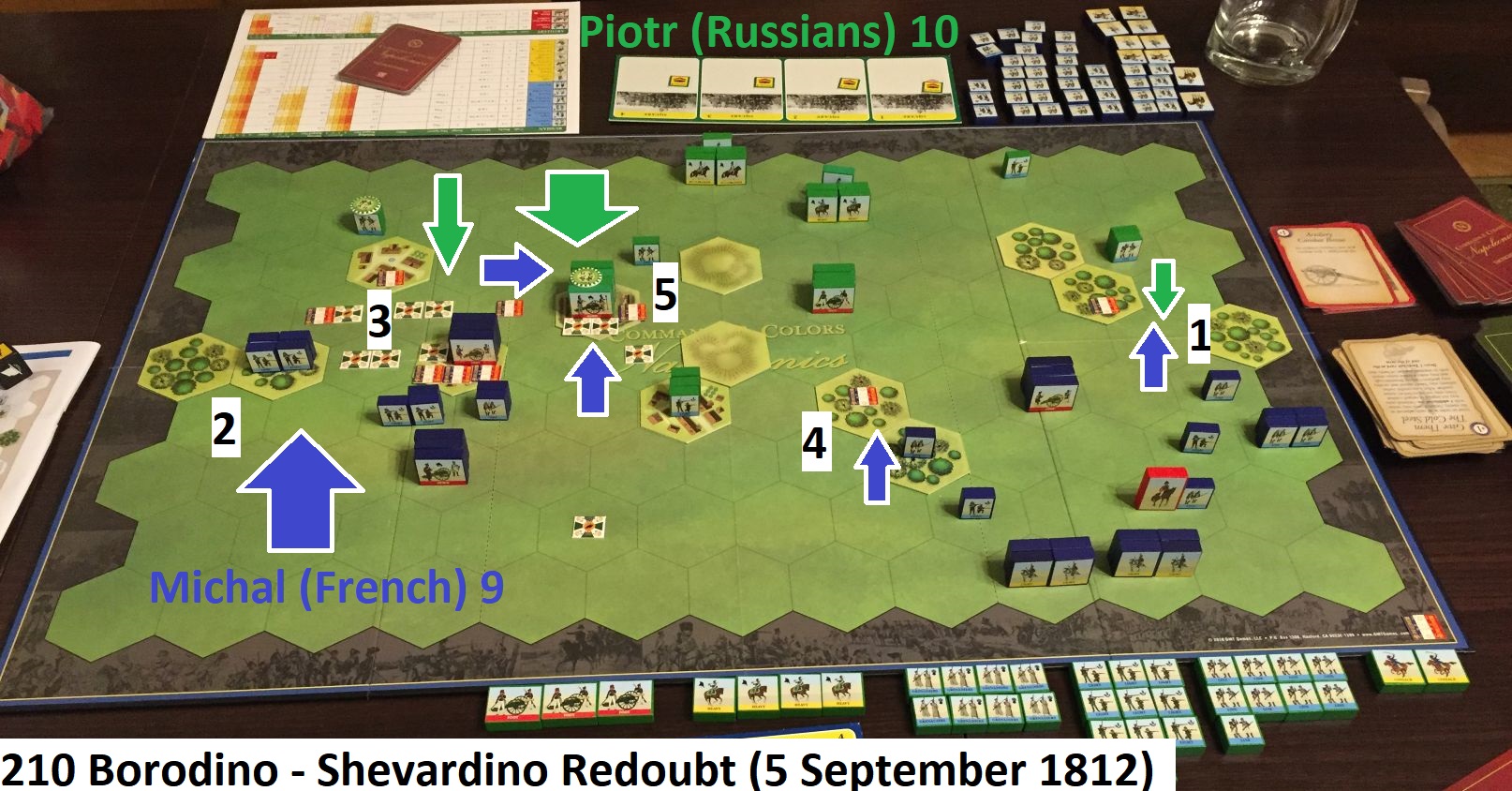 Recently I had a pleasure to play a face-to-face game of C&C Napoleonics with Piotr. We are now focusing of Expansion 2 and just started the Napoleon’s campaign in Russia. First, we have 4-scenario Borodino campaign. The scenario one is Shevardino Redoubt: