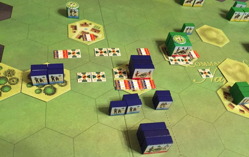 - As you can see above (click to enlarge), between the woods and two towns a real blood-bath occurred; towns are crucial in this scenario for Russians (if they do not occupy them, I am getting 1 VP for each) so Piotr relentlessly counter-attacked. Of course, I was not giving up…