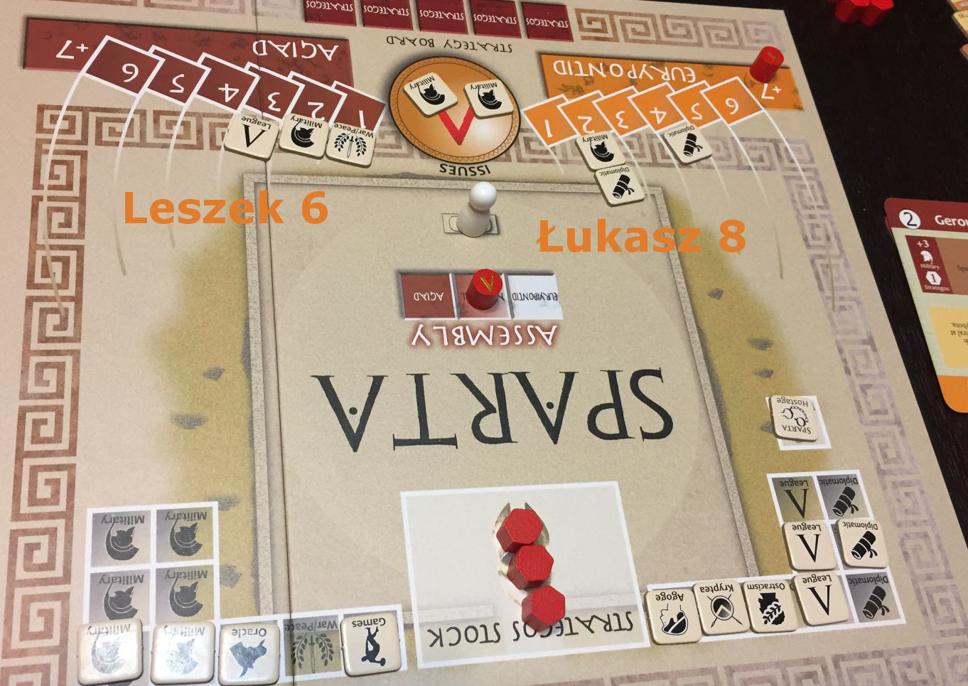 Instead of describing how to conduct a debate, it is much easier to ask new players to play one! Leszek and Lukasz quickly grasped fundamental mechanics, also using the brain trust concept and acquiring strategos by playing appropriately aligned cards.