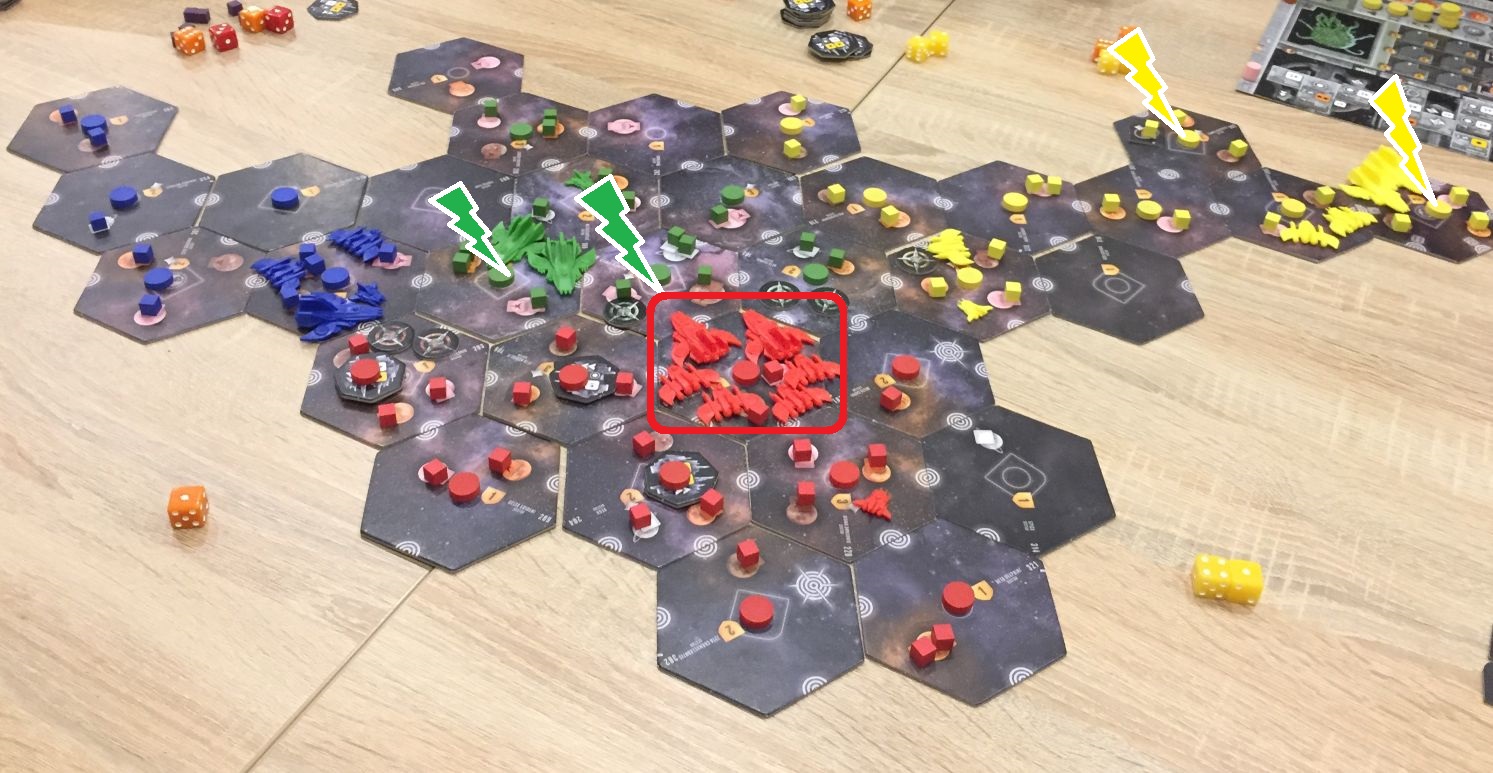 We start the game. Initial 2 rounds see fast expansion of Planta (Lukasz), and Draco (Mine) while Magellan (Andrzej) and Mechanema (Kuba) try to catch-up (click to enlarge)Things are getting tense. I take overanother 4 regions, Kuba is getting close to center as do I. Do you so what Planta is doing? We forgot about him completely… Andrzej has very, very bad draws and hard start…. (click to enlarge)This is called “pre-emptive strike”. Kuba attacks Andrzej, and thanks to superb technologies, wipes out the enemy fleet (click to enlarge)Tension is maximal. I build my fleet, Kubatakes over center, and Plant, ach, Planta does whatever he wants… (click to enlarge)The build up of forces results in clash in the center. I will lose 6 ships, Kuba will lose 3 and win battle (click to enlarge)In the end, Andrzejwho plays first finishes on fourth place. Me and Kuba are very close matched and near the center. And Lukasz and his Planta score enormous 57 pointsand wins! (click to enlarge)