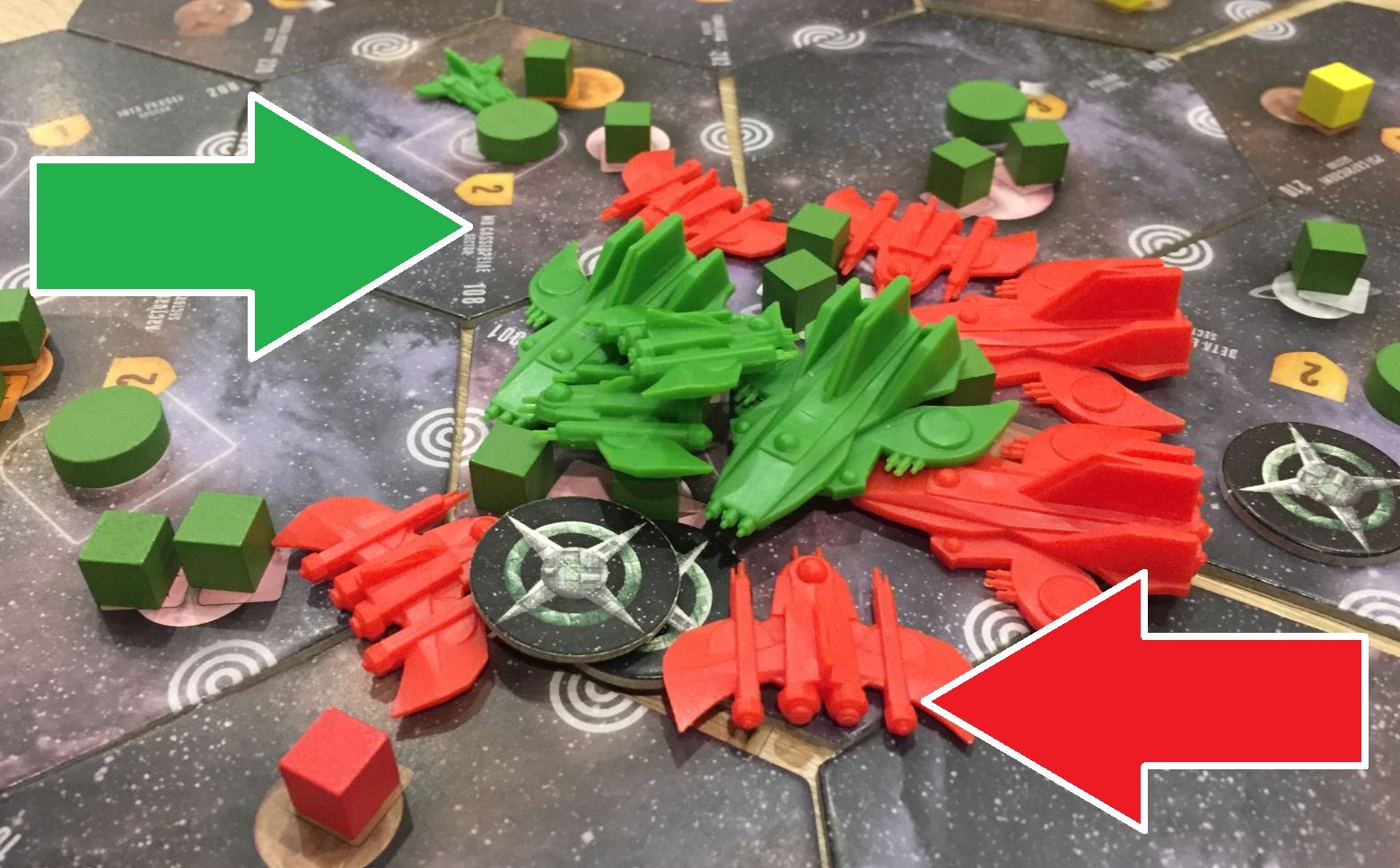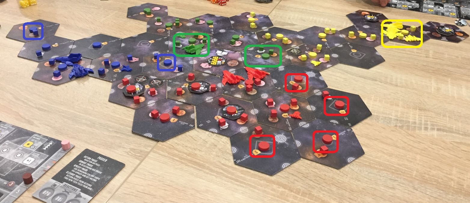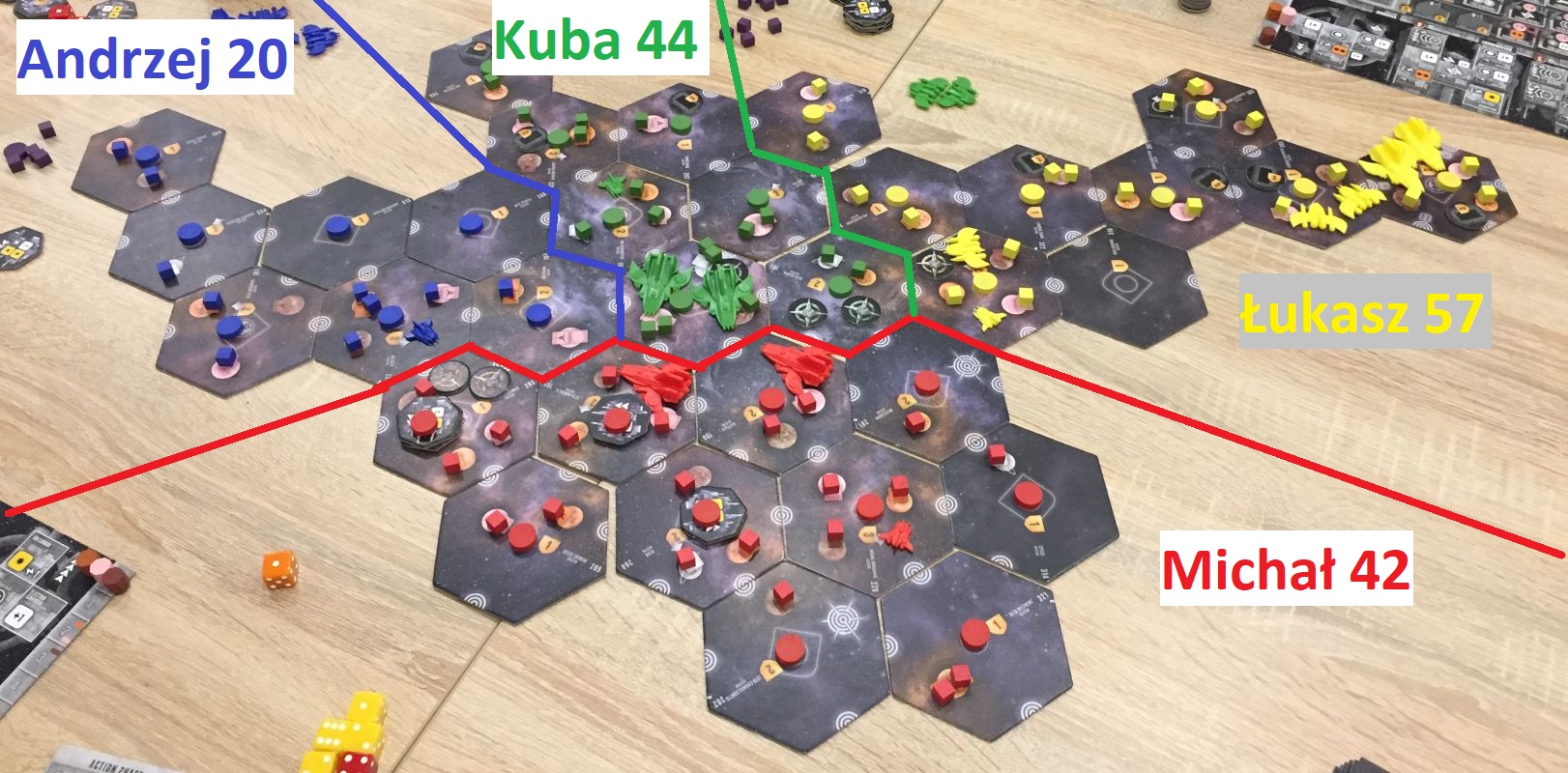 We start the game. Initial 2 rounds see fast expansion of Planta (Lukasz), and Draco (Mine) while Magellan (Andrzej) and Mechanema (Kuba) try to catch-up (click to enlarge)Things are getting tense. I take overanother 4 regions, Kuba is getting close to center as do I. Do you so what Planta is doing? We forgot about him completely… Andrzej has very, very bad draws and hard start…. (click to enlarge)This is called “pre-emptive strike”. Kuba attacks Andrzej, and thanks to superb technologies, wipes out the enemy fleet (click to enlarge)Tension is maximal. I build my fleet, Kubatakes over center, and Plant, ach, Planta does whatever he wants… (click to enlarge)The build up of forces results in clash in the center. I will lose 6 ships, Kuba will lose 3 and win battle (click to enlarge)In the end, Andrzejwho plays first finishes on fourth place. Me and Kuba are very close matched and near the center. And Lukasz and his Planta score enormous 57 pointsand wins! (click to enlarge)