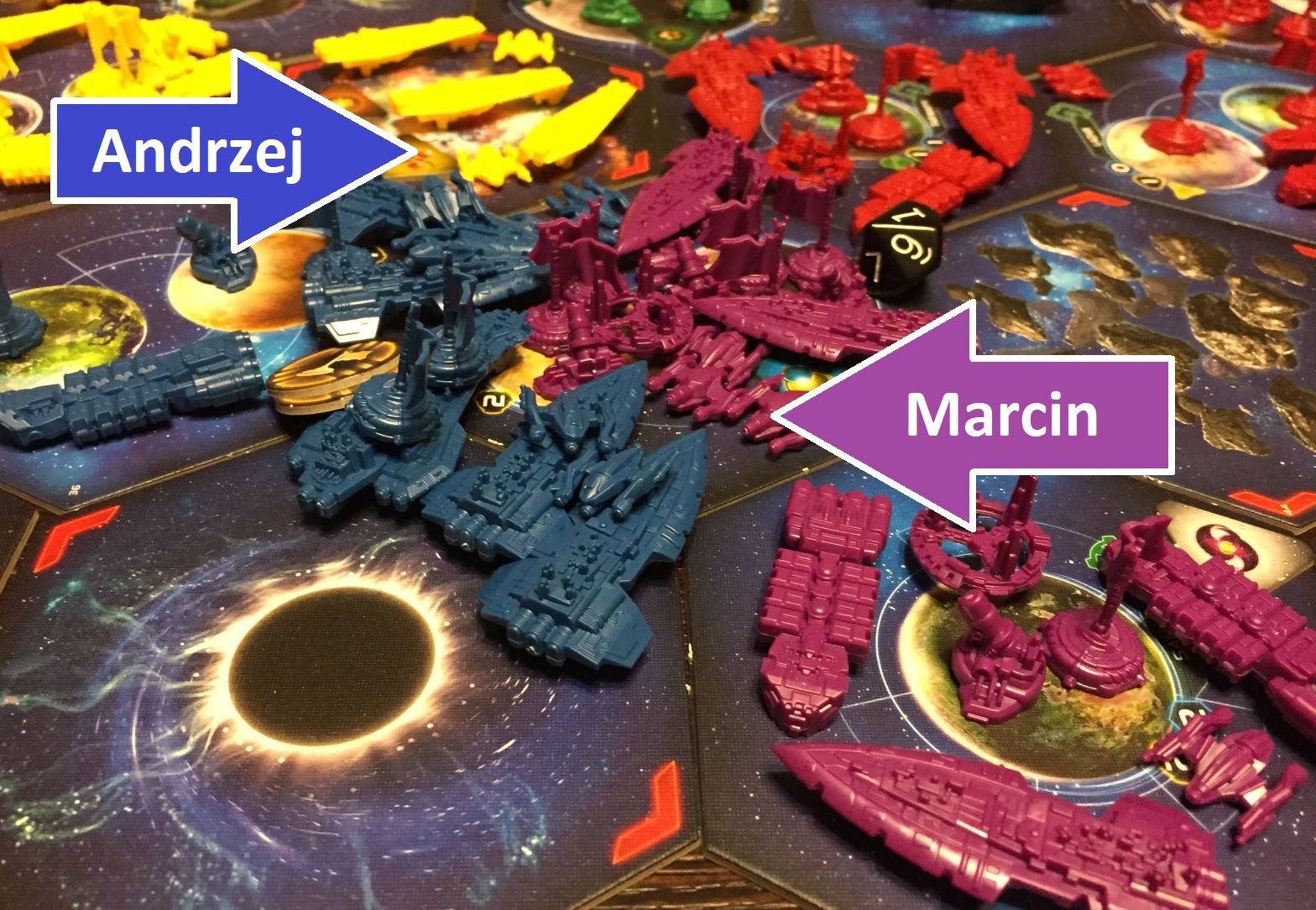 Our initial set-up and game board (click to enlarge)The first blood was drawn very quickly – Marcin takes overs systems colonized by Andrzej’s Sol Confederation (click to enlarge)Still, the proud inhabitants of Earth are first to Mecatol Rex! (click to enlarge)Mid-game (after turn 3). You can observe steady expansion of all nations toward the center. The board is divided – as far as cooperation is concerned – in two groups Mentak, Saar and Yin vs Yssaril, Hacan and Sol. Tension grows… (click to enlarge)…until it erupts. My forces are being attacked by Kuba J. I am able to repeal attack but that means two objective will have to wait for potential scoring. (click to enlarge)After round 5. Kuba G firmly took over the Mecatol, and also the lead in points. So it seems game over? Well, not necessarily… (click to enlarge)They said “save the galaxy”, they said “you can do it”. They said ” do not worry about the odds”. So I did not. And attacked Mecatol Rex – what the fight it was… (click to enlarge)…and what a victory. So we played on. (click to enlarge)Do you remember “first blood”? Yes, the payback time has come. Andrzej annihilated Marcin’s fleet, but was able to take over one planet only – still gaining one additional VP. (click to enlarge)After turn 6. We will be finishing soon ans Kuba needs only 1 point to win the game. But before this Bartek (Hacan) attacks his fleet and score secret objective. (click to enlarge)It is last turn and all things are possible. I need to destroy enemy flag ship for secret objective. So another payback time (for the previous invasion). Successful and 1 VP for me. (click to enlarge)And the situation at the end of the game. Total chaos, many hot spots and total annihilation in many places. (click to enlarge)As for the scores, Kuba G. wins with 2 points lead, followed by Andrzej (great debut!) and others. (click to enlarge)