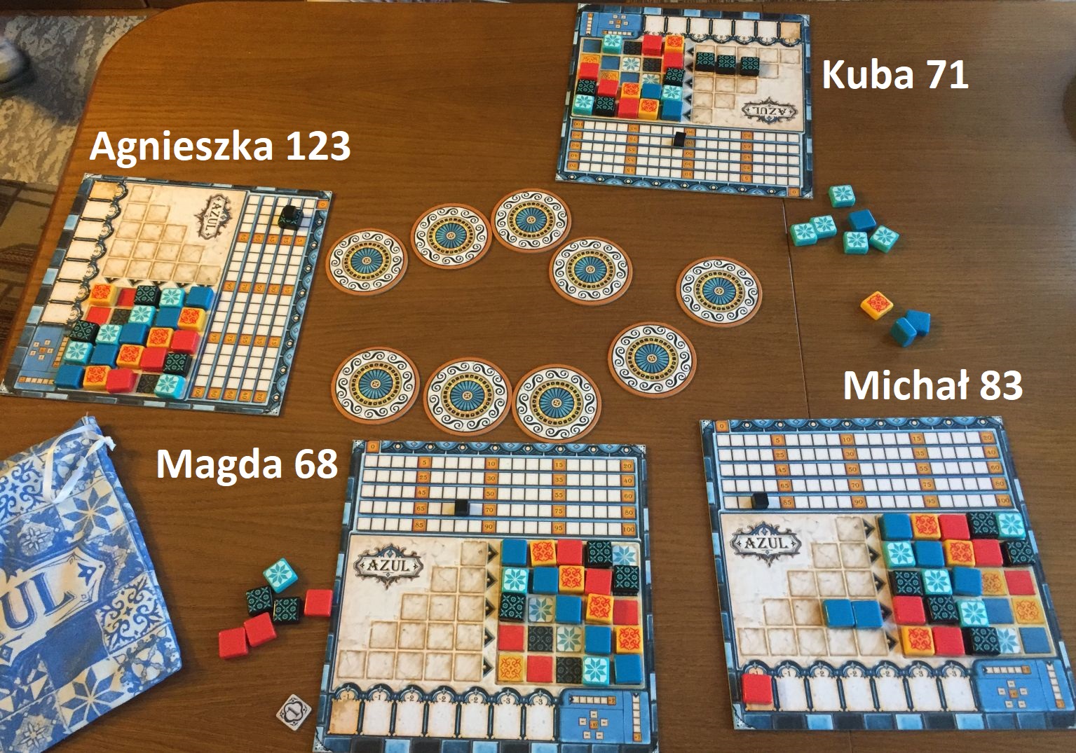 Przy okazji wyprawy do Lublina i kilku uroczystości wykorzystaliśmy moment między licznymi spotkaniami plus standardowymi posiłkami i udało się zagrać rodzinnie w planszówki! Na stół trafił Azul – gra piękna, szybka, interesująca i bardzo przez wszystkich lubiana – zwłaszcza Agnieszkę, o co jasno widać po wynikach 🙂 Kuba grał pierwszy raz, ale bardzo dobrze sobie dawał radę, Agnieszka drugi raz a my z Magdą po raz nie wiadomo który – czego zdecydowanie ostateczny wynik nie oddawał 🙂