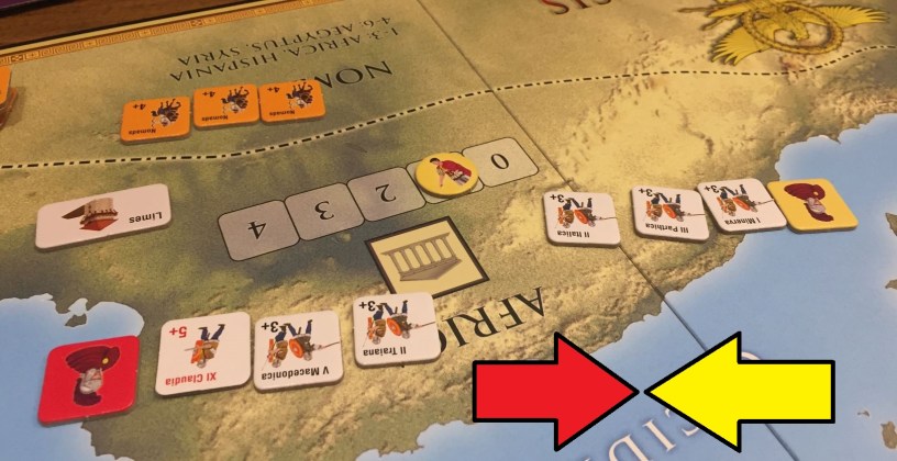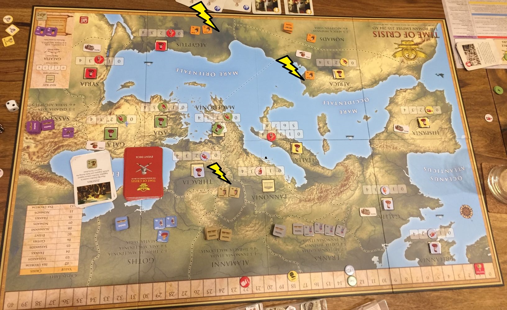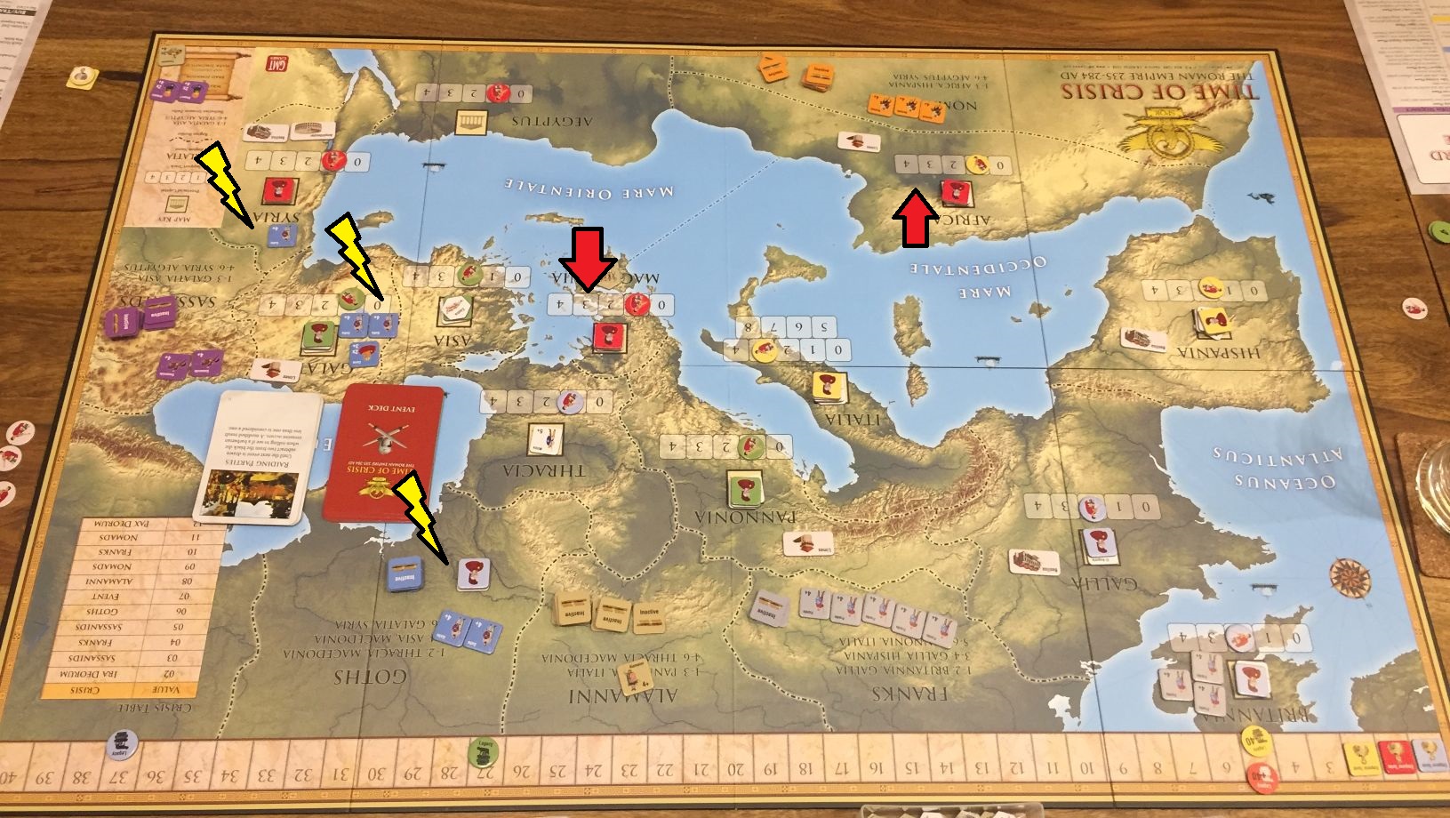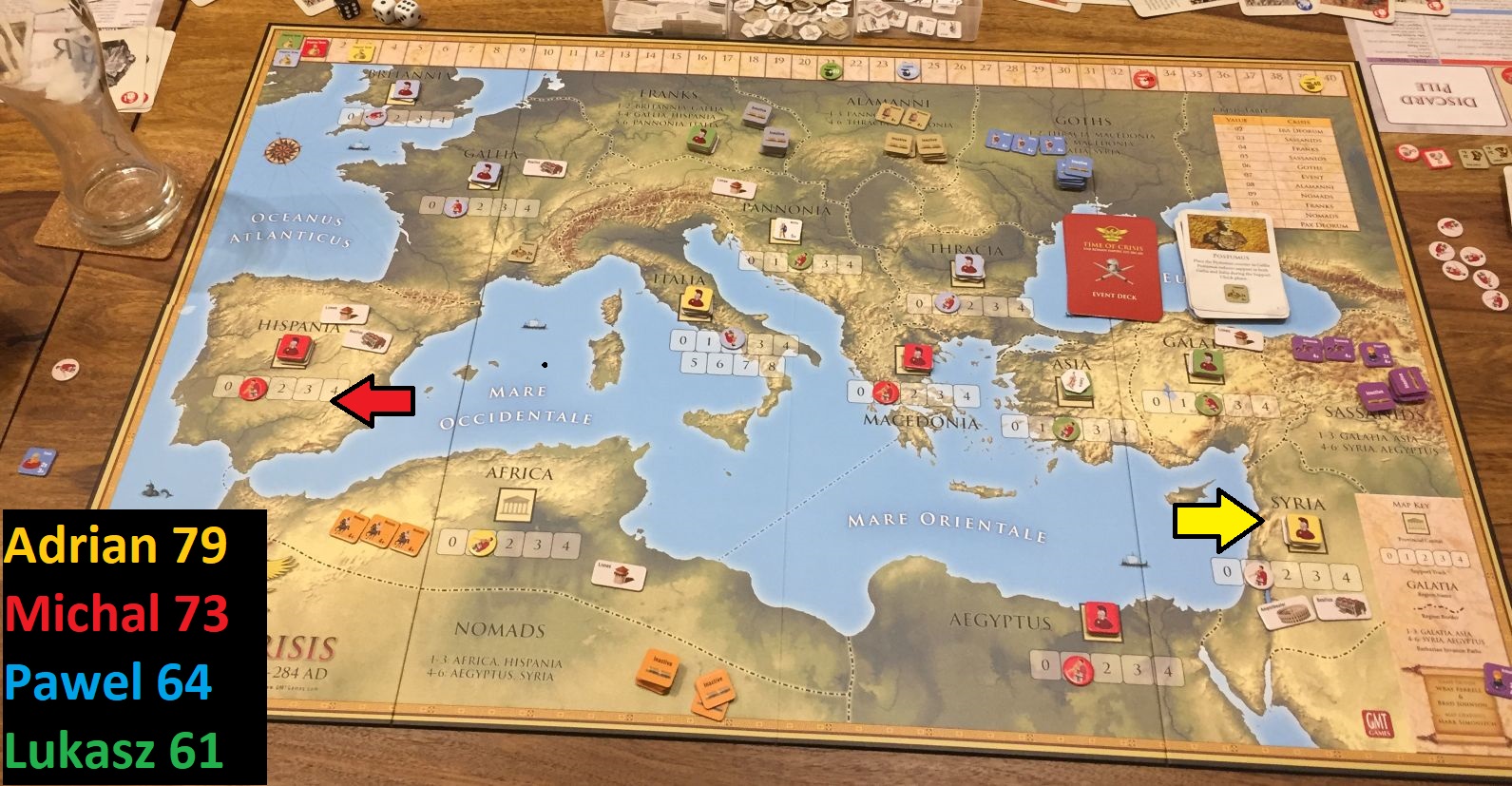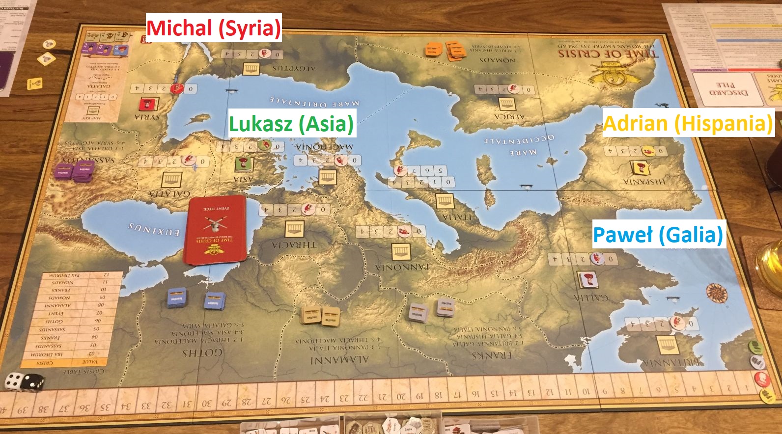 So we start with above set-up – me and Lukasz more concentrated on East, while Adrian and Pawel focus on WestMy beginnings were really difficult. First Priest King……and immediately after that Zenobia! Both attack were repulsed but with losses ad interrupted build of initial rounds.We played with the card variant where you mix base game and expansion cards seeing only the top one. That was fun and additional suspense element.Here come the first emperor! (me 🙂 ) As we had two new players we decided we will not use the variant with type of emperors – that is planned for next game!Situation in 1/3 of the game (click to enlarge). Barbarians are slow to move but finally attack!In the meantime Adrian takes Italy – which with his army in capital will be hard nut to crack…Pawel gave signal to clear our lands from Barbarian infestation, easily dispatching two Allemanni warbands!We are nearing end of game (click to enlarge). My and Adrian states fares the best, but barbarians are restless – a huge Goth attack is directed at Galatia and Syria. Pawel sends punitive expedition into the Goth homeland while in the meantime Franks grows enormously, Macedonia falls into my hands and in Africa Adrian’s troops are forced to retreat by my red legions. Not for long…Franks finally move, and when they do, the whole Western part of empire weeps…It has to come to this – the clash of pretenders in Africa. Adrian decisively beats my forces (3-0 in losses)And final situation on map (click to enlarge). We switch our capitals with Adrian and he got also most points for turns being an emperor – which gave him victory in the game. Congratulations! Pawel and Lukasz fight for third place till the end of the game, with former one winning the race.