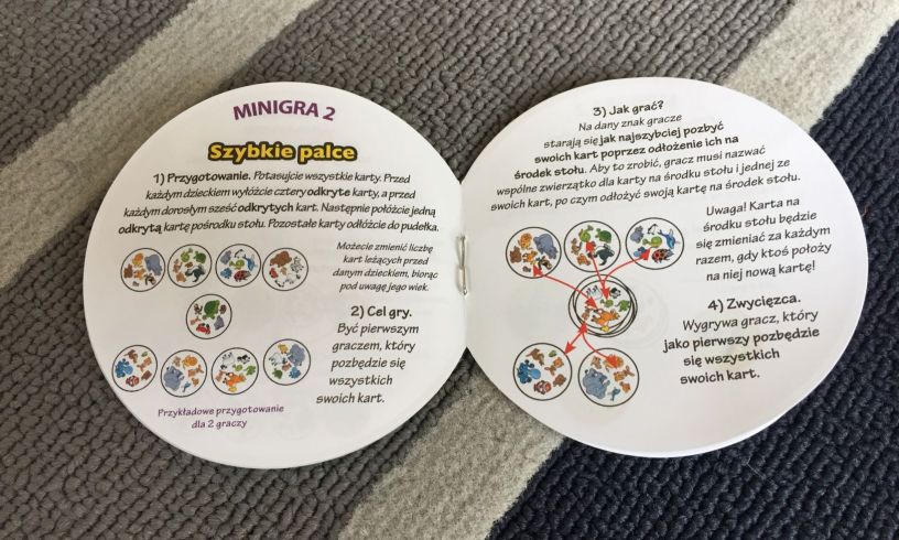 To dosyć klasyczna wersja Dobble – każdy ma swój stosik, w środku jest wieża i kto pierwszy znajdzie pasujące zwierzę i je nazwie, dostaje kartę: