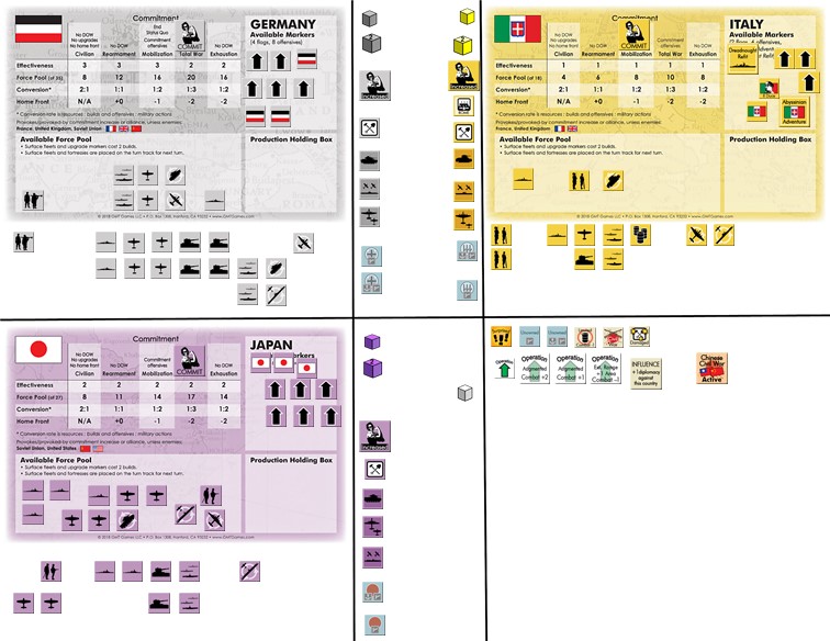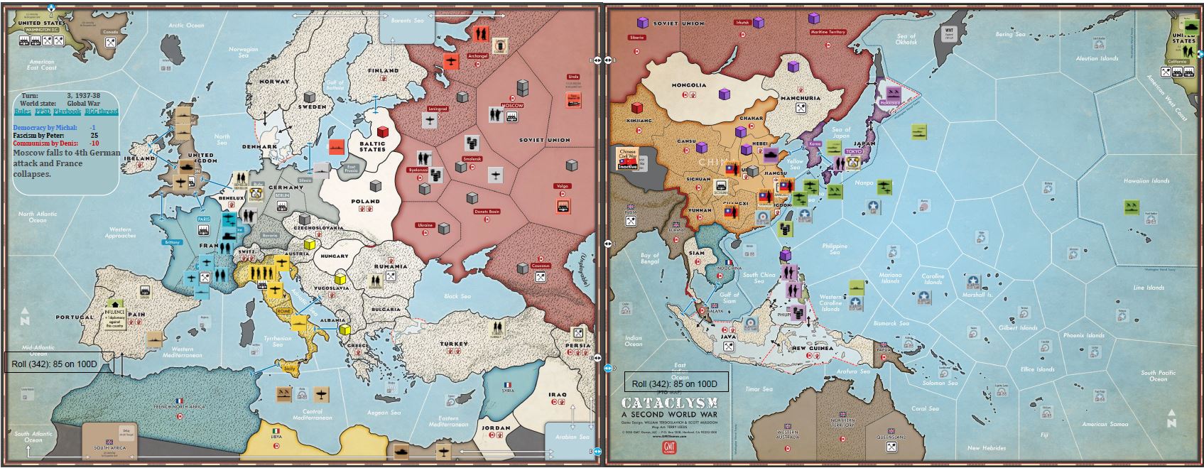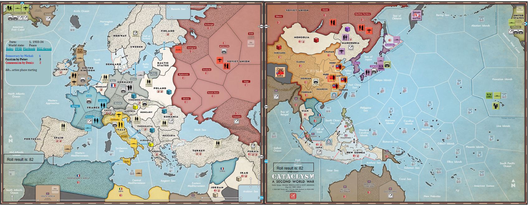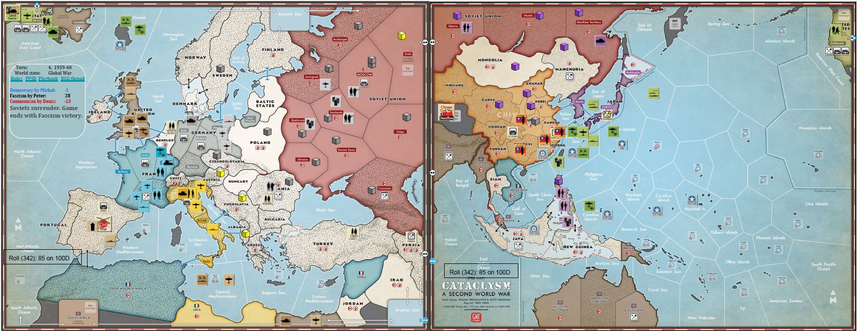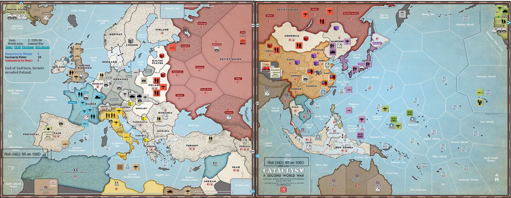 The game was very exciting, USSR survived around 20 stability rolls but in the end surrendered. My Allied forces were unlucky – UK missed 3 declaration of war, and joined the struggle too late to change the course of events. US was unstoppable on Pacific Ocean but without Philippines unable to make a landing on home islands. All in all, that was great fun, very exciting and interesting play. To that extent, that we already had our second game using this method (that time it took us much longer 🙂