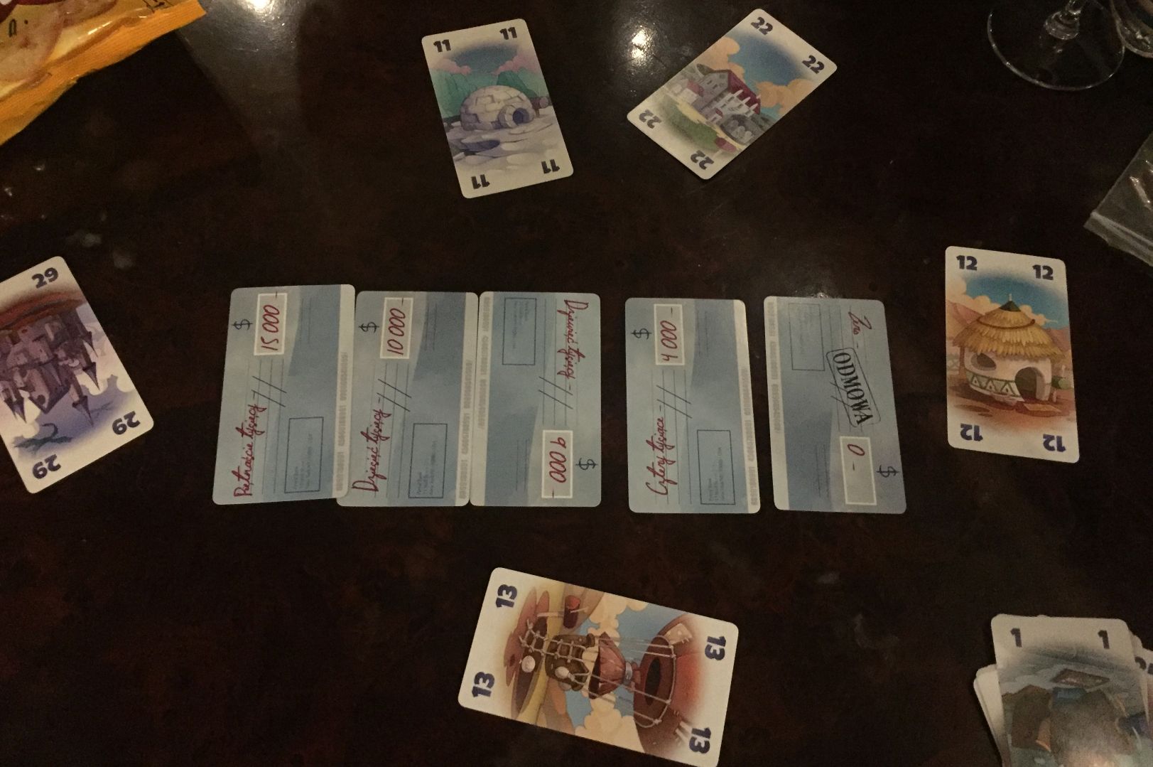 Tym razem licytujemy nieruchomości i to podwójnie. Najpierw każdy z nas ma określoną kwotę, którą licytuje z innymi graczami nieruchomości o numerach od 1 do 30. Potem Te nieruchomości sprzedajemy – za czeki od 0 do 15’000$. Przy czym sprzedając losujemy czeki a każdy w tajemnicy przygotowuje lokum do sprzedaży. Największa zabawa jest przy odkrywaniu tych kart – zdarzają się blefy, szalone zagrania a czasami po prostu pomaga szczęście.