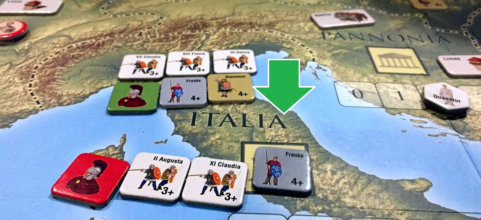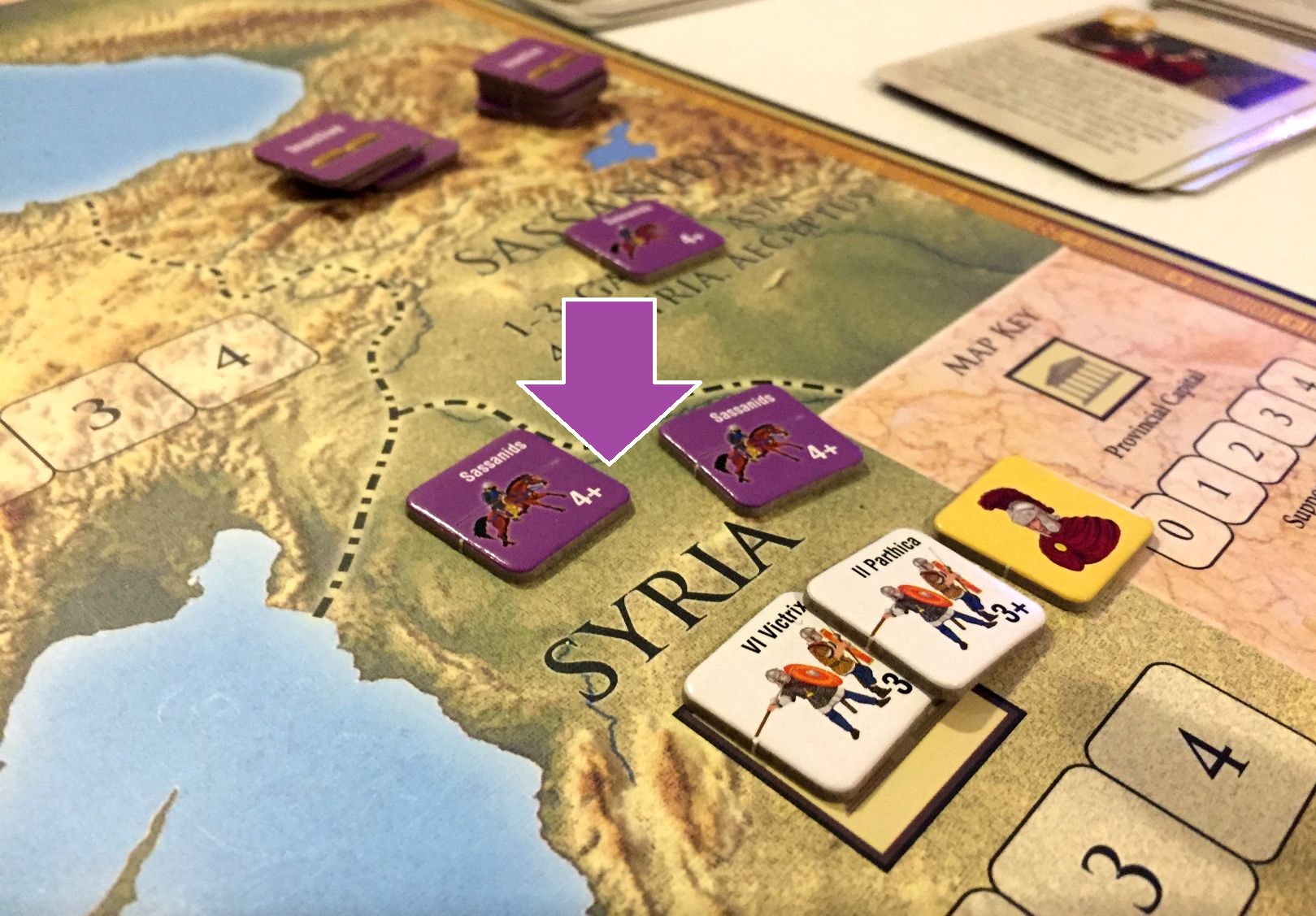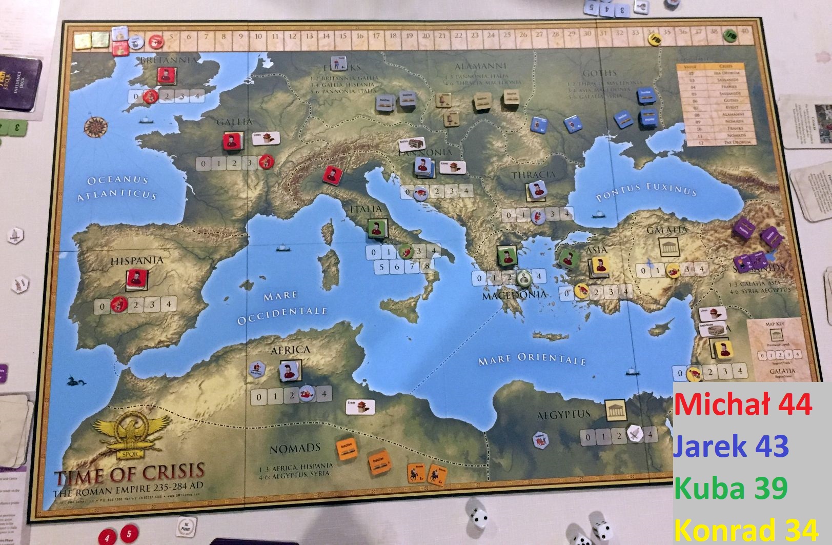 Ostatnia pozycja wieczoru to jedna z naszych ulubionych gier wydawnictwa GMT – Time of Crisis. Walki o utrzymanie pokoju i spokoju w targanym kryzysem III wieku Imperium Rzymskim podjęło się czterech graczy. Krótka relacja poniżej (szersza będzie już wkrótce)Całe wschodnie połacie Cesarstwa były notorycznie i nieustannie najeżdżane przez Sassanidów. Konrad dzielnie z nimi walczył, ale starty pierwszych tur rozwoju były nie do odrobieni (kliknij by otworzyć w nowym oknie)O stolicę imperium walka była zażarta – najpierw Jarek, potem ja a podczas końca rozgrywki Kuba zajmowaliśmy Rzym.Z powodu ograniczeń czasowych nie zagraliśmy do pełnych 60 punktów ale skończyliśmy po 40 (wersja krótka tak nam wyszła). Ostateczne wyniki powyżej – pozostał jednak pewien niedosyt… (kliknij by otworzyć w nowym oknie)