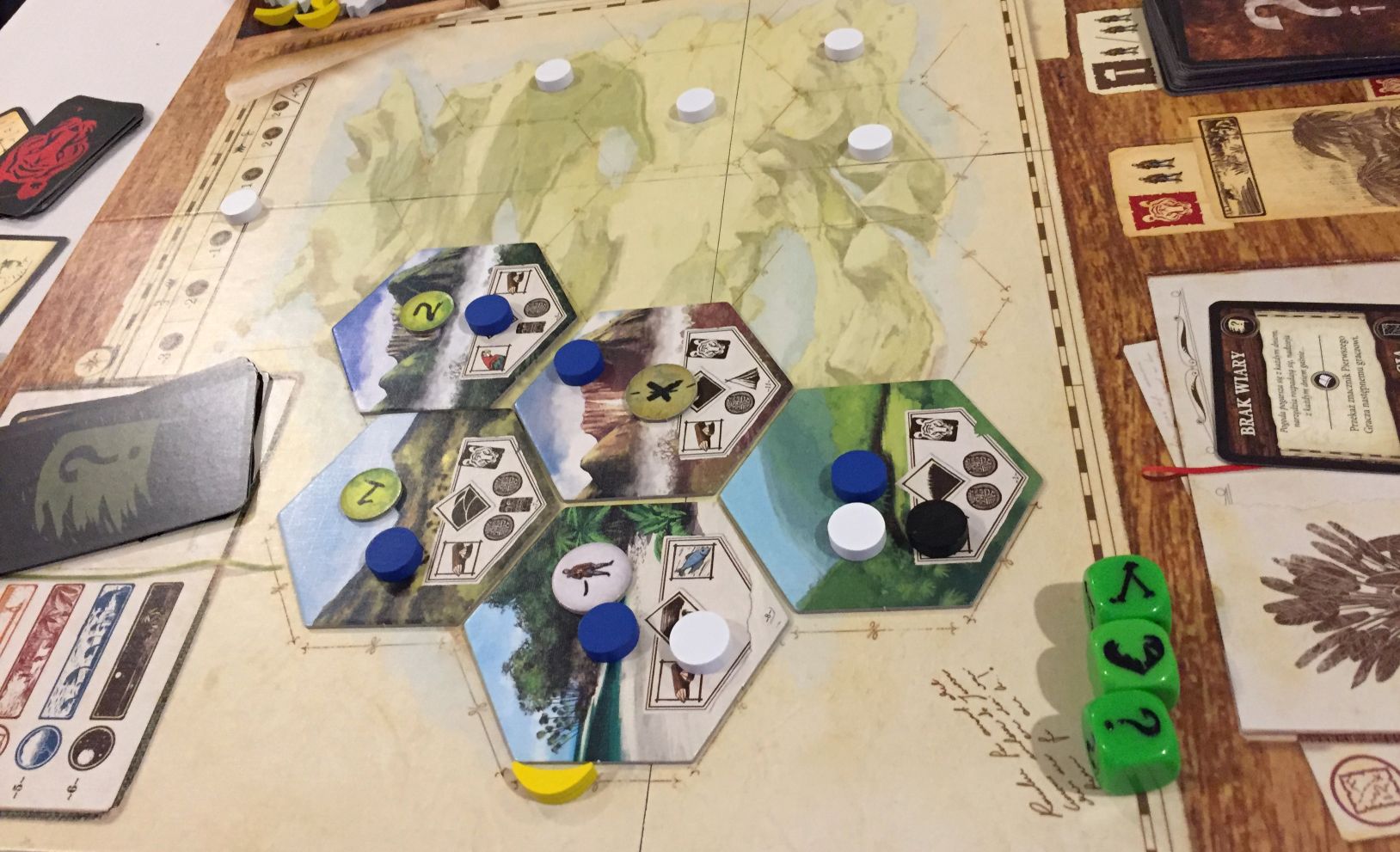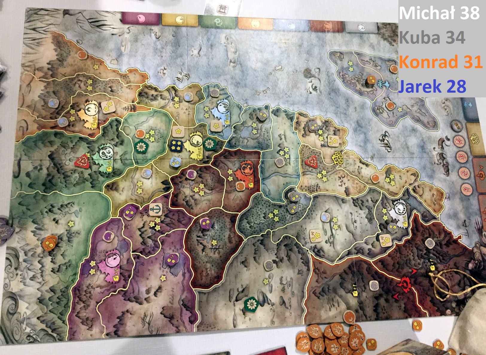 Ten tytuł bardzo nas zaintrygował – Jarek reklamował to jako tytuł dla fanów planszówki “Gra o Tron” (do których jak najbardziej się zaliczamy). Wszystkie ruchy, ataki, najazdy floty, itp. zagrywane są żetonami. Mieliśmy naprawdę duży ubaw i wiele radości z rozgrywki – oczywiście, interakcji negatywnej było co niemiara! W tej intensywnej rozgrywce ostatecznie wygrał mój klan Kraba (kliknij by otworzyć w nowym oknie)