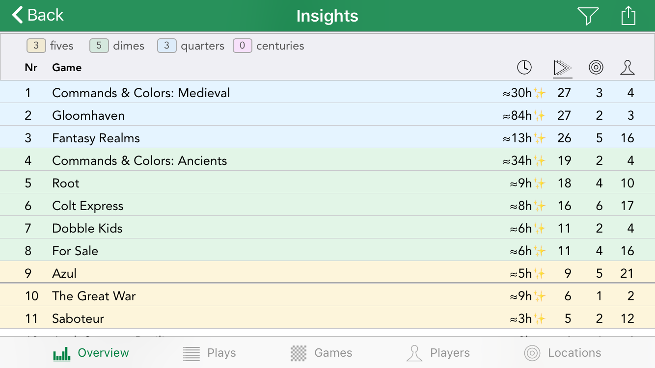 • dimes – played 10 times or more – here is quite a nice representation, starting with my all-time-most -played-game: Commands Colors Ancients. I am really glad that I managed to pull 18 games of ROOT. Other three, Colt Express, Dobble or For Sale, are either short euros or games I played with kids.