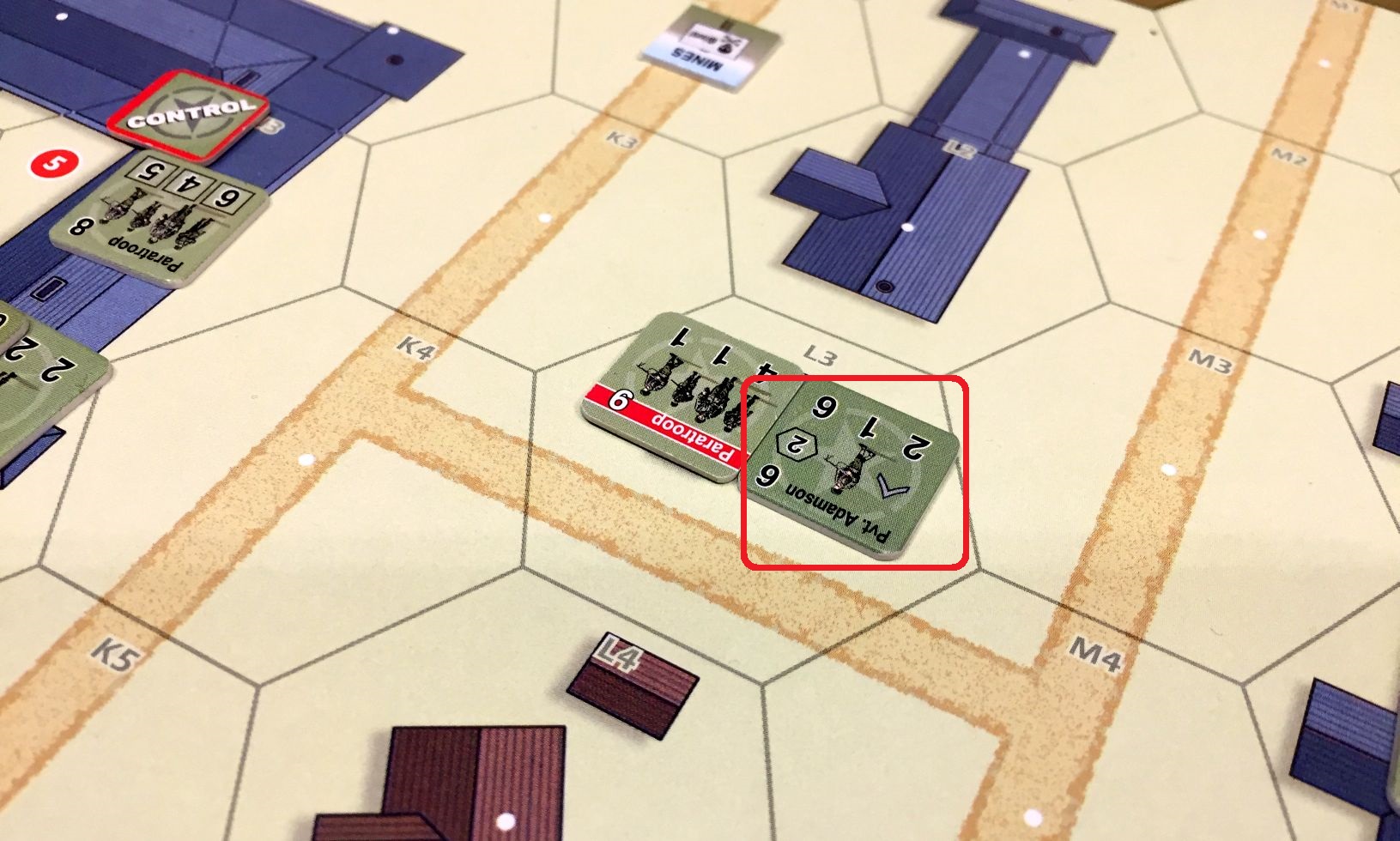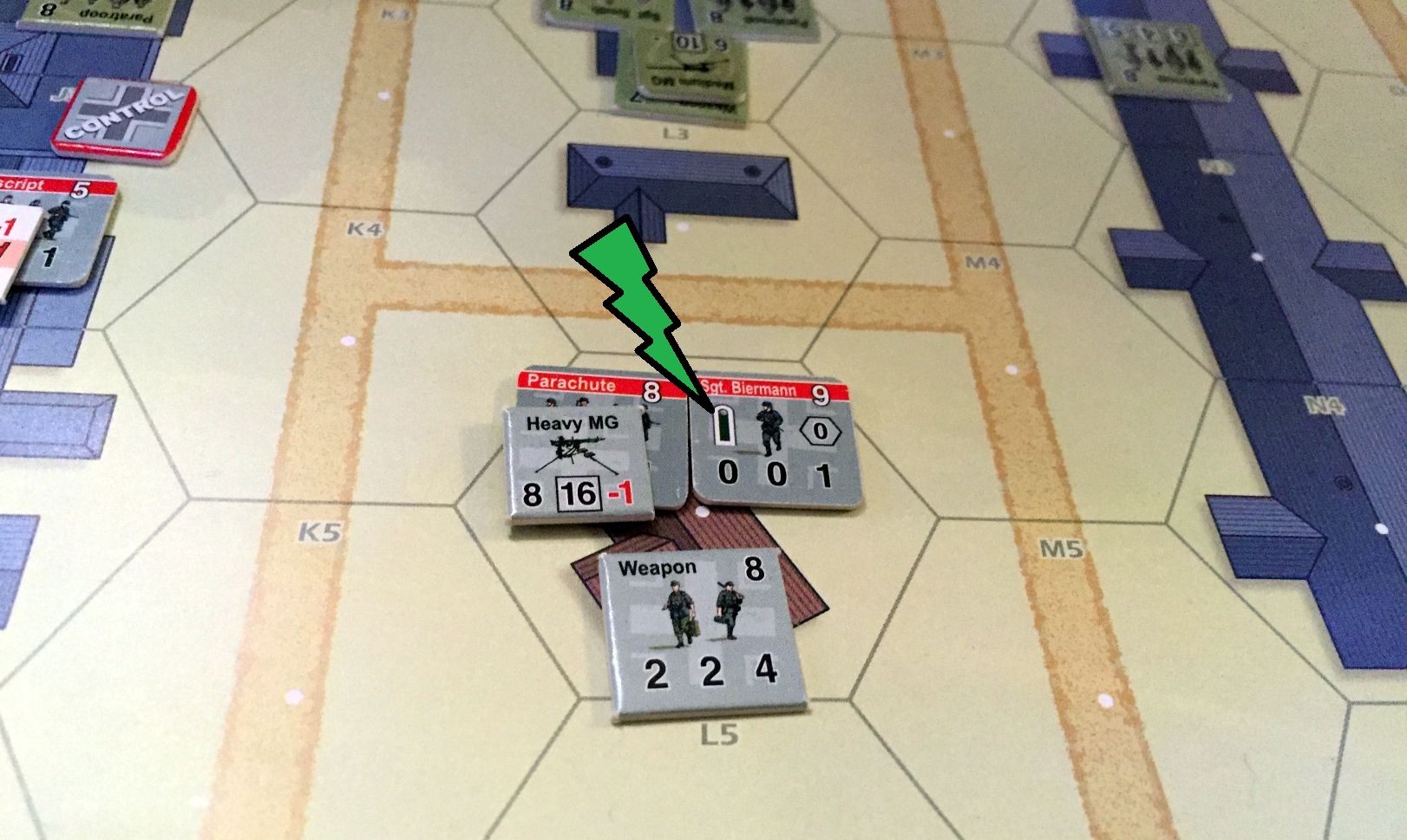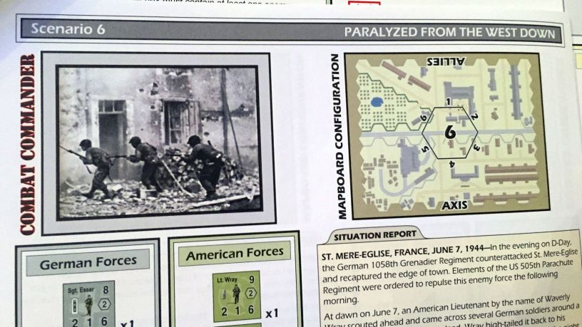 Scenario “#6 Paralyzed from the West Down” describes the events from the Operation Overlord – exactly in a city of St. Mere-Eglise, where surprised German line troops try to repeal the counter-attack of elite US Parachute Regiment. Wehrmacht starts with 1 order per turn, increasing by one each “Time!” event, up to three. Allies had a lot of units, very well equipped and on elite level. Who would prevail?