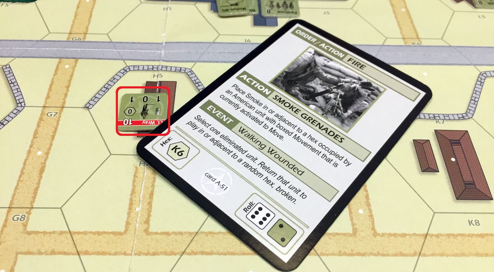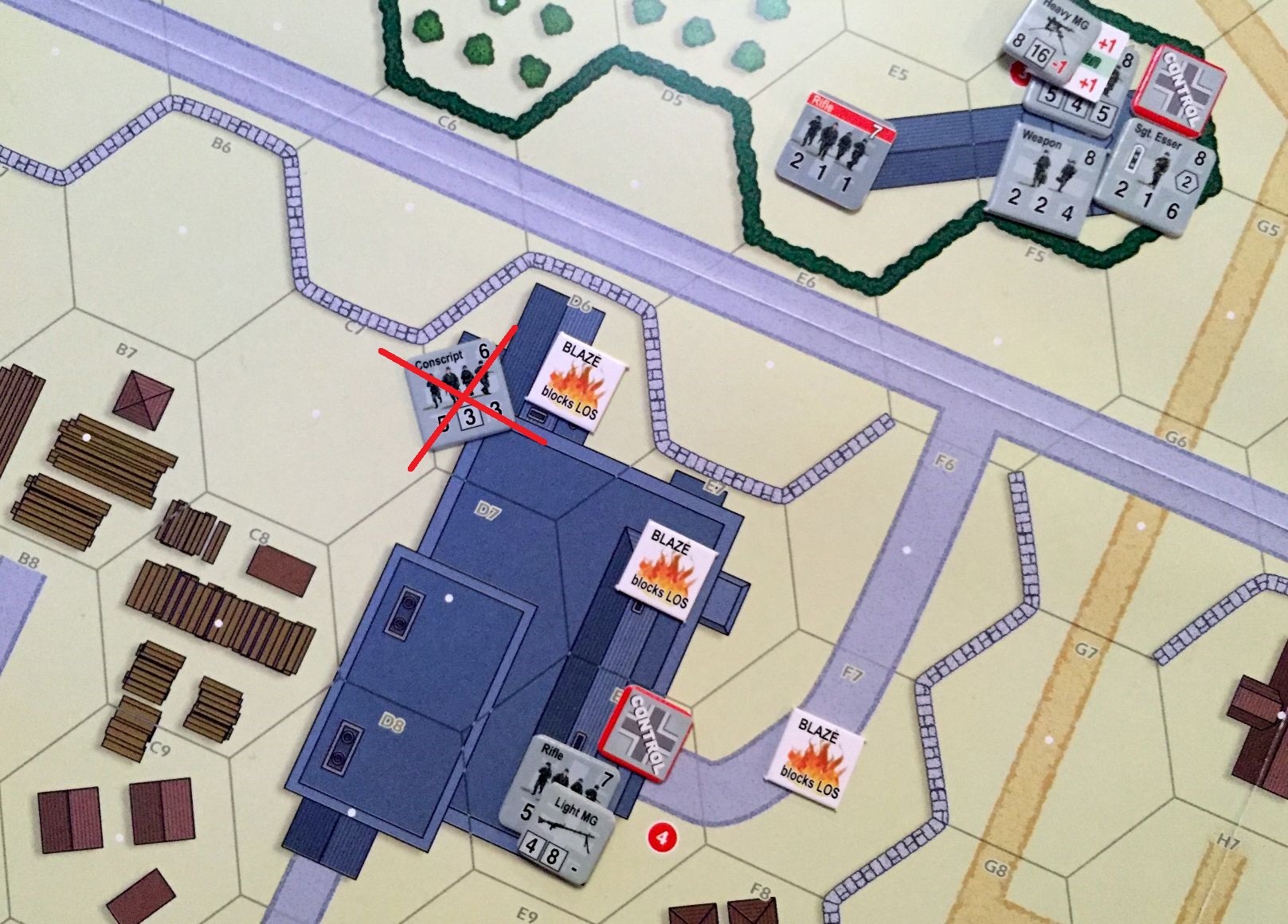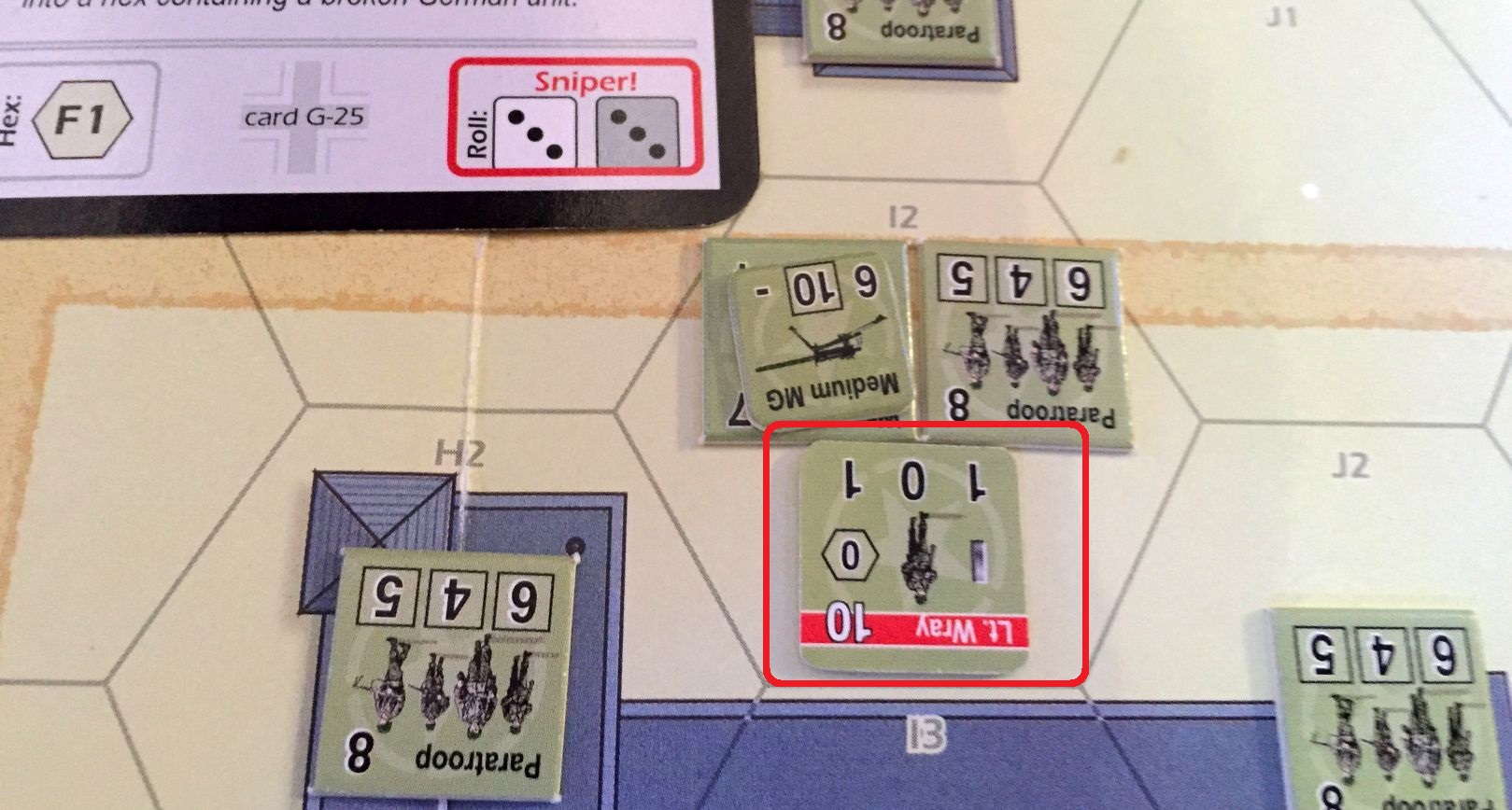 Scenario set-up – Konrad (USA) enters from top, two hex deep while my surprised Germans, who control all objectives, has to repel the attack (click image to enlarge)A sniper is always a dangerous situation; this time he got Lt. Wray! (click image to enlarge)Now, that is a great event – German reinforcements – MG42 enters the game! (click image to enlarge)Well, the idea to put the MG in that building was great but Konrad had very good rolls for attack. Will they hold? Will I draw Recover in the end? (click image to enlarge)Lt. Wray was really unfortunate fellow. He was spotted by sniper and then tripped over an entrance to the building and was outright killed… A tremendous loss for US (click image to enlarge)Hm, that blaze started very thematically in the factory but dangerously closed to my unit and objective point! (click image to enlarge)Not surprisingly Konrad advanced on me. I was sure to die (Konrad rolled 8) but I also activated sniper and you know what, he hit attacking American! In the end we killed each other… (click image to enlarge)We had blaze many times in our scenarios, but never so extensive! What is more, one of my defending units was burned alive! (click image to enlarge)Situation mid-game. Germans keep hold of four objectives, US troops have one. The causalities on both sides are staggering and the end result is pretty open.(click image to enlarge)Yeah! The poor Lt. Wray comes back onto the board on the random hex. Only to be killed by MG42 fire the next turn… He is definitely the weakest point on US side in that scenario…(click image to enlarge)US troops lost also another leader and were left with only one. Fortunately, the field promotion puts one of the privates on the board. (click image to enlarge)Just when Konrad and his US troops started to recover, we reached Turn 6 and a Sudden Death roll finished the game. (click image to enlarge)The result was a decisive German victory (19 VP). The loses were huge on both sides and three more units o killed on German side would force my surrender (click image to enlarge)
