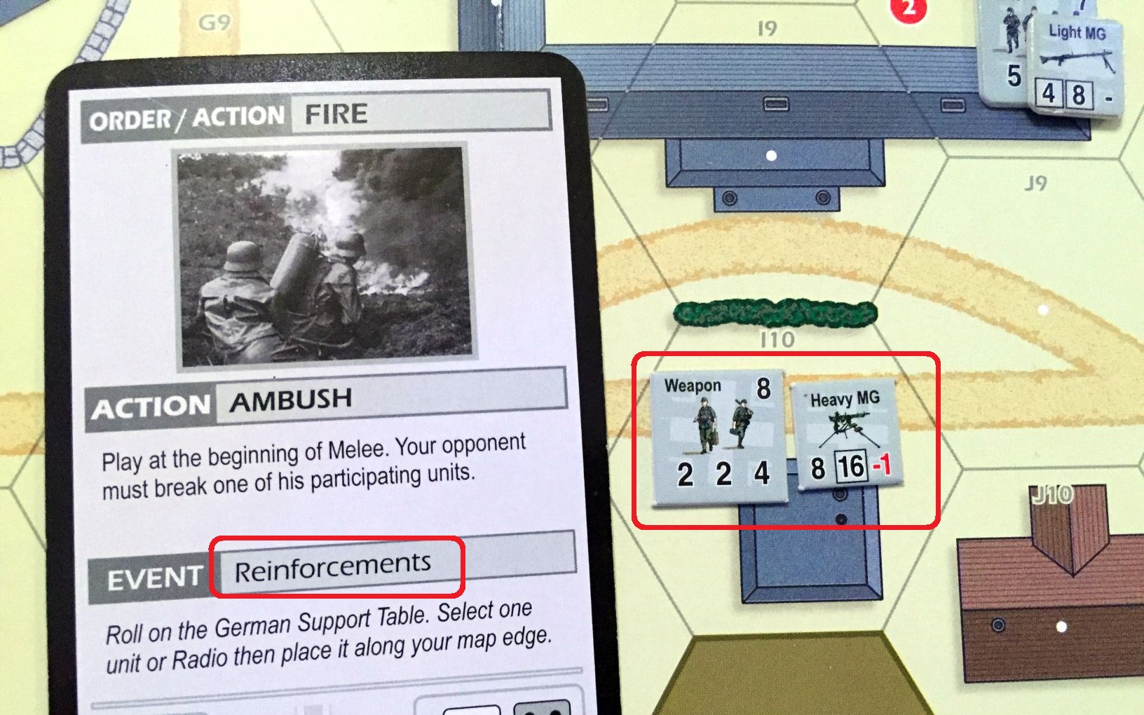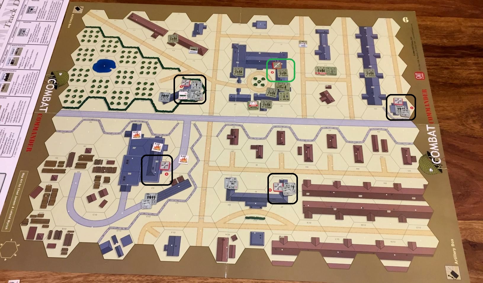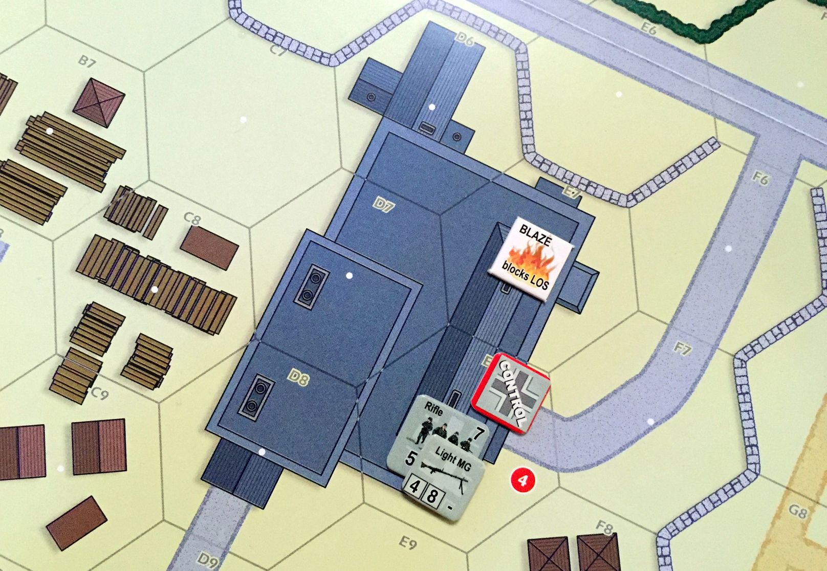 Scenario set-up – Konrad (USA) enters from top, two hex deep while my surprised Germans, who control all objectives, has to repel the attack (click image to enlarge)A sniper is always a dangerous situation; this time he got Lt. Wray! (click image to enlarge)Now, that is a great event – German reinforcements – MG42 enters the game! (click image to enlarge)Well, the idea to put the MG in that building was great but Konrad had very good rolls for attack. Will they hold? Will I draw Recover in the end? (click image to enlarge)Lt. Wray was really unfortunate fellow. He was spotted by sniper and then tripped over an entrance to the building and was outright killed… A tremendous loss for US (click image to enlarge)Hm, that blaze started very thematically in the factory but dangerously closed to my unit and objective point! (click image to enlarge)Not surprisingly Konrad advanced on me. I was sure to die (Konrad rolled 8) but I also activated sniper and you know what, he hit attacking American! In the end we killed each other… (click image to enlarge)We had blaze many times in our scenarios, but never so extensive! What is more, one of my defending units was burned alive! (click image to enlarge)Situation mid-game. Germans keep hold of four objectives, US troops have one. The causalities on both sides are staggering and the end result is pretty open.(click image to enlarge)Yeah! The poor Lt. Wray comes back onto the board on the random hex. Only to be killed by MG42 fire the next turn… He is definitely the weakest point on US side in that scenario…(click image to enlarge)US troops lost also another leader and were left with only one. Fortunately, the field promotion puts one of the privates on the board. (click image to enlarge)Just when Konrad and his US troops started to recover, we reached Turn 6 and a Sudden Death roll finished the game. (click image to enlarge)The result was a decisive German victory (19 VP). The loses were huge on both sides and three more units o killed on German side would force my surrender (click image to enlarge)