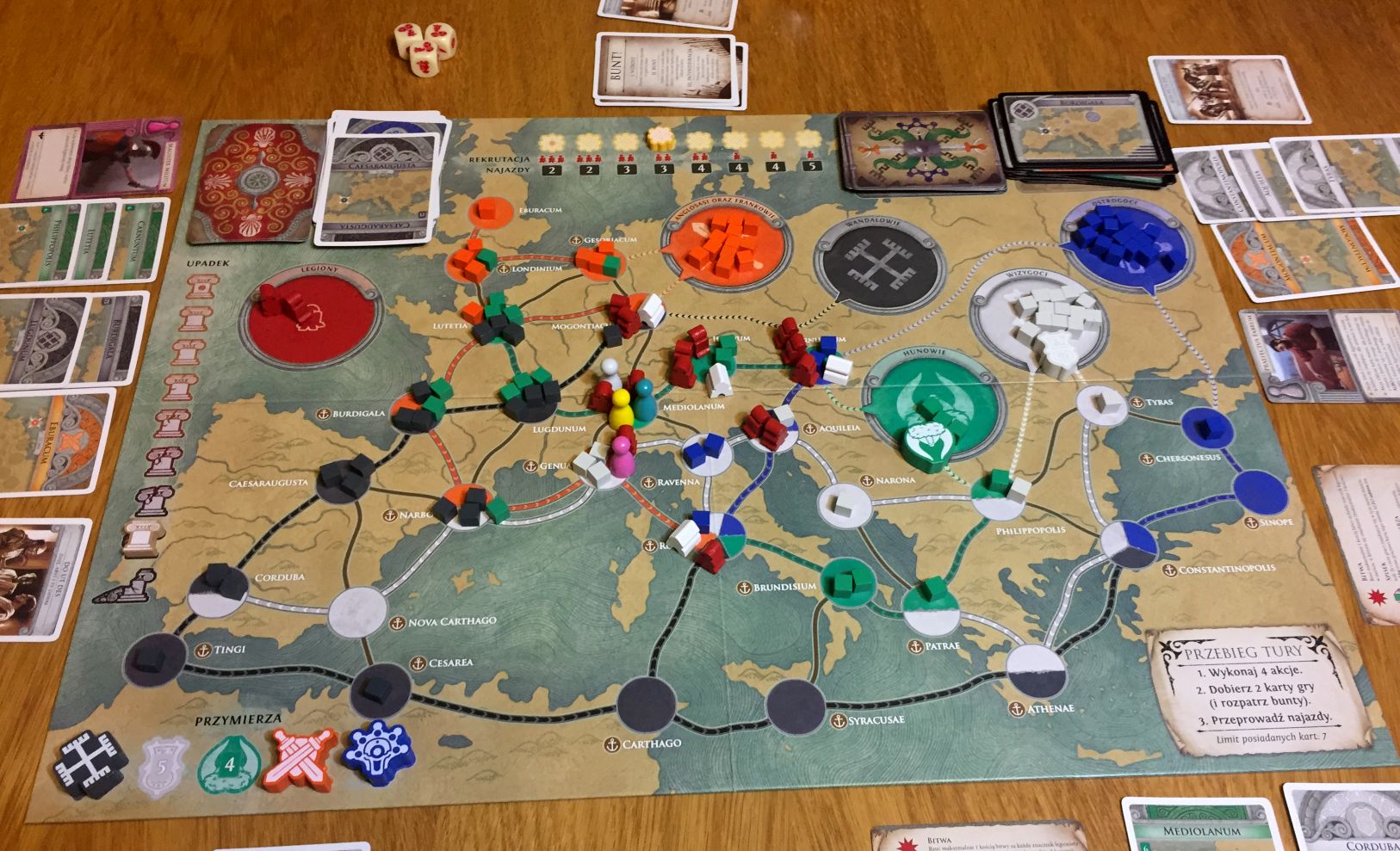 Już w niedzielę z Tomkiem i Erykiem zasiedliśmy ponownie do Pandemii. Nie mogliśmy pogodzić się z porażką z poprzedniego dni i postanowiliśmy spróbować ponownie.Znając grę szło nam dużo lepiej i ostatecznie – po podpisaniu paktów z Frankami, Wandalami, Ostrogotami i Wizygotami oraz wytrzebieniu do zera Hunów Imperium Rzymskie ocalało!