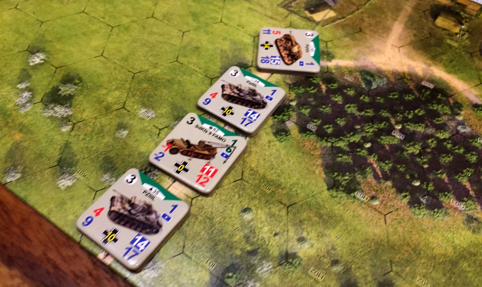 It was the first time that we played on full, four maps area; above you can see the disposition of the forces – Germans (blue), Soviets (red). And the closeups follow… (click to enlarge)…the hunters (lead by me)…. (click to enlarge)…the rescue team (lead by Kuba)…. (click to enlarge)…and the hunted – Wounded Tiger, so main point of the whole scenario! (click to enlarge)Turn 1 was very interesting – my pack of T34/T70 closed quickly on Tiger, using a small village as a cover. Still, two of my tanks were hit but not yet destroyed. At the same time the German rescue team was approaching from a flank (click to enlarge)Beginning of Turn 2 – very crucial moment of the game – Tiger flanked by T-34 and destroyed in two salvos!However, that was not end of the game. By no means! The German rescue team transformed into the attack force, killing quickly two of my tanks. As we do not have the wreckage expansion, we used smoke as depiction of places with the destroyed armor (click to enlarge)Situation mid-game (after TURN 2): My Soviets in the lead as far as points are concerned, Kuba with lost Tiger but other then that unscratched (click to enlarge)The battle rages on – in Turn 3 and 4 another 3 of my tanks and one of Kuba’s are destroyed. I am greatly surprised by special card Germans have which allows one of their tanks to be automatically recovered (click to enlarge)Turn 5 is our struggle for victory – both sides shoot on pretty low probabilities but luck – and 1 point victory – goes to Kuba (Germans) (click to enlarge)End of game status situation on the map – all causalities marked in colors (click to enlarge)End of game status situation on the players mats (click to enlarge)