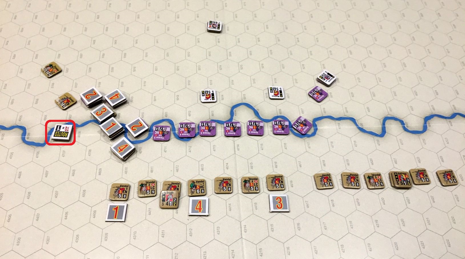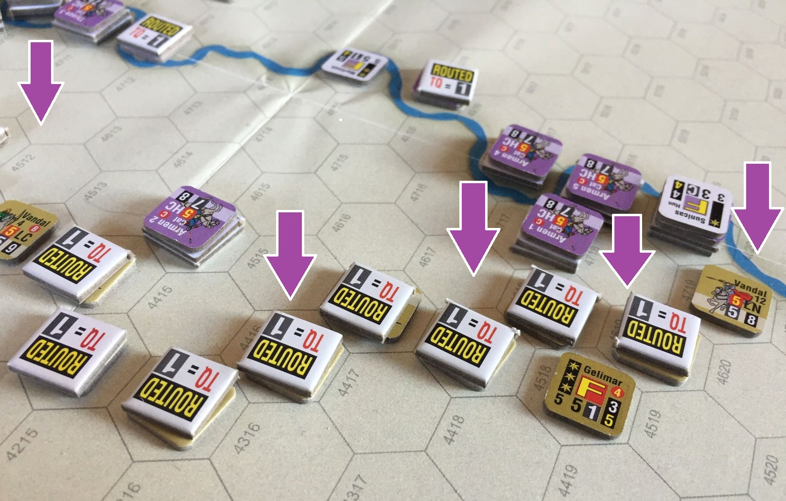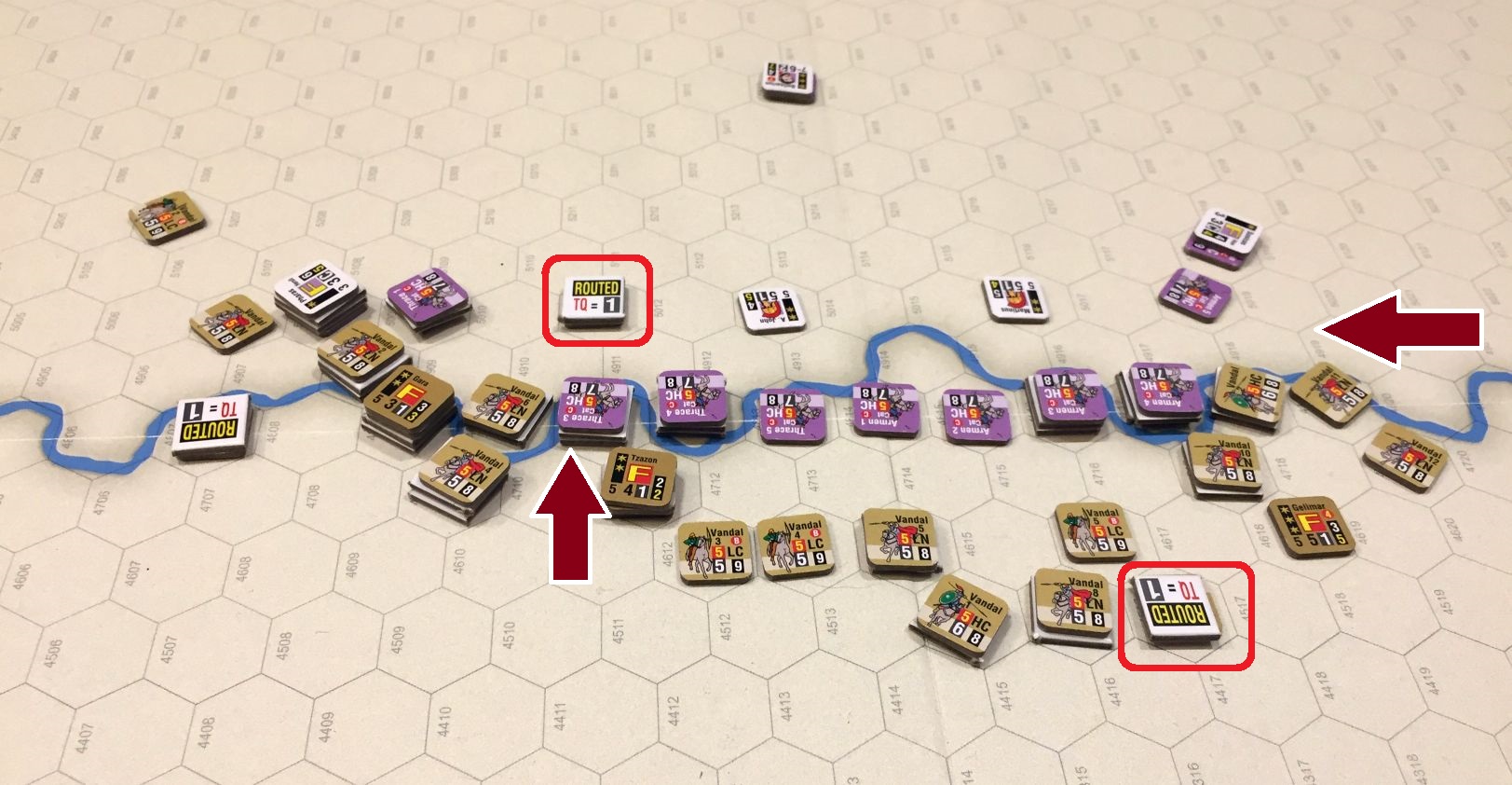 The main Byzantine push was in the center where almost all units – save one LC unit, which can withdraw – were routed. In that phase 10 Vandals and 2 Romans started to flee.