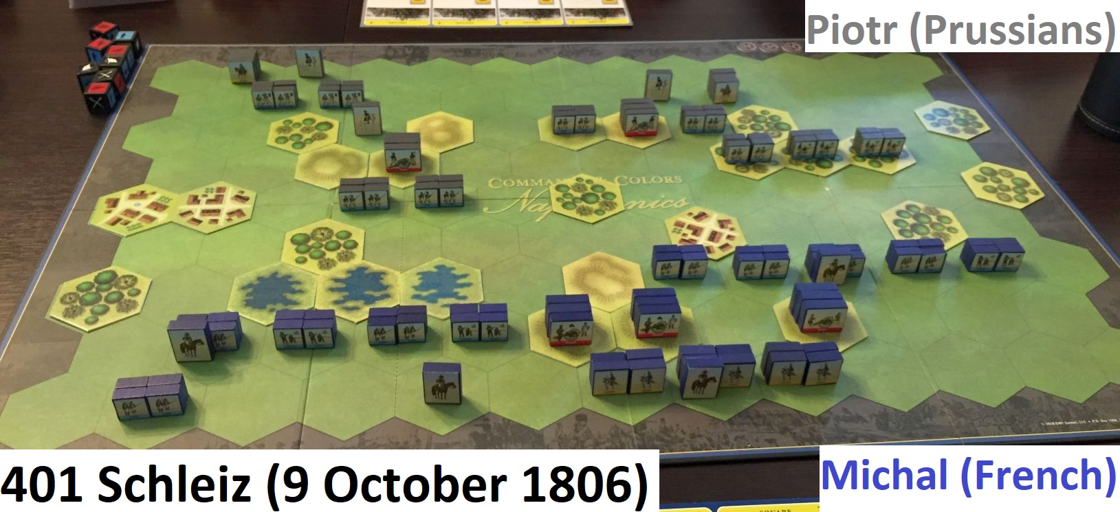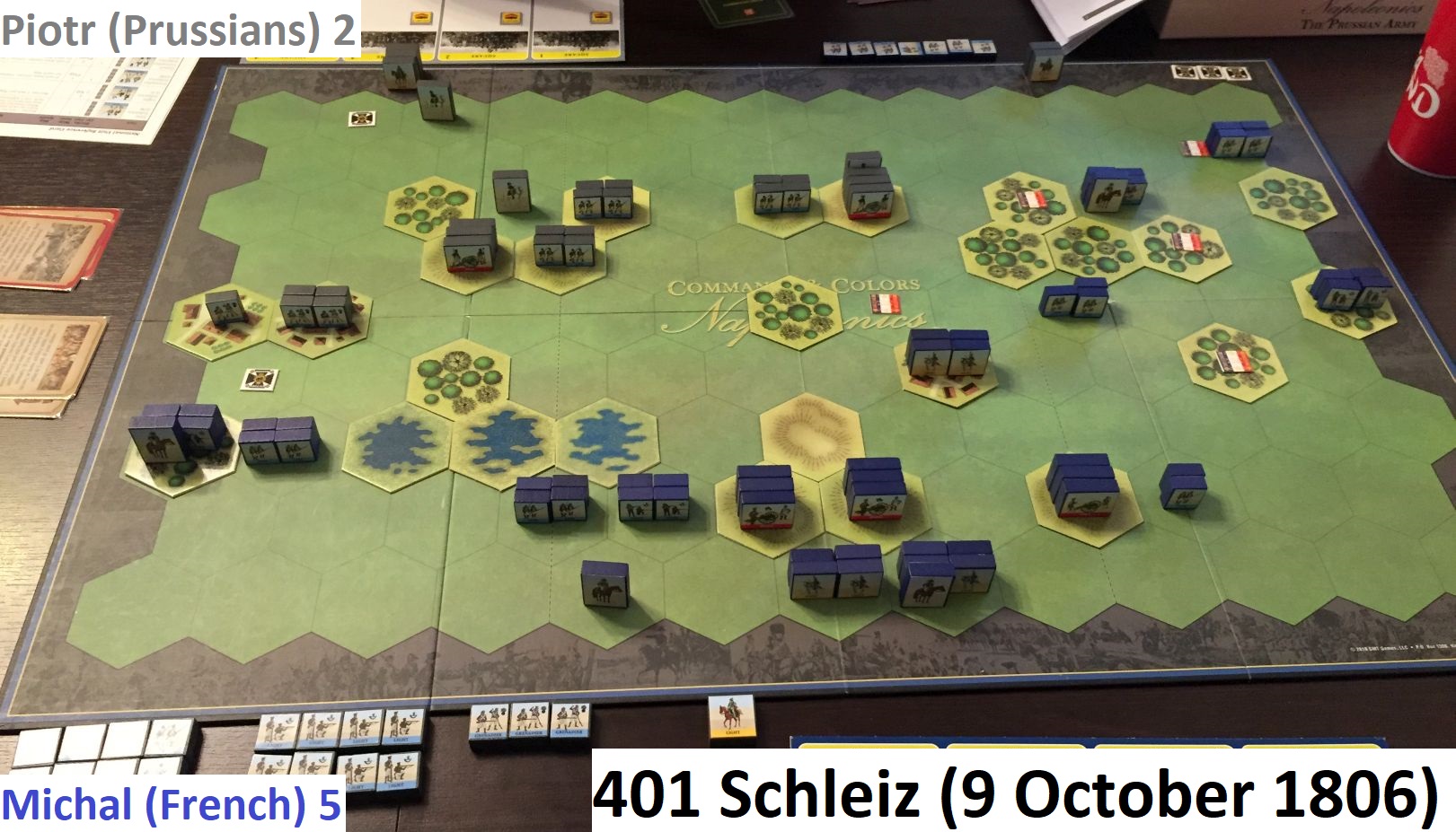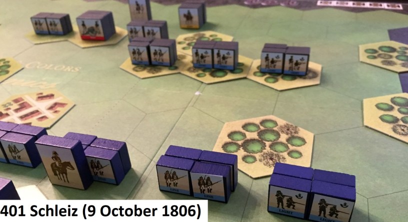 A short note (based on https://www.commandsandcolors.net/napoleonics/) regarding the context of the battle: In the first clash of the Fourth Coalition, Bernadotte, at the head of Napoleon’s center column, moved against Tauentzien’s Prussian/Saxon division near the village of Schleiz. Tauentzien, realizing that the French were advancing in strength, sent Bila’s troops forward to slow the French advance, while he waited for reinforcements or orders to retreat. Bernadotte did not wait, but swiftly issued orders of his own. Soon Werle’s advance guard moved against the Oschitz Woods, while Drouet attacked Schleiz. By early afternoon the French could not be stopped and Tauentzien decided to fall back to Auma in an attempt to maintain a link with his outlying commands. The retreat came too late to save one Prussian battalion.