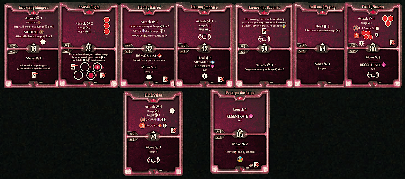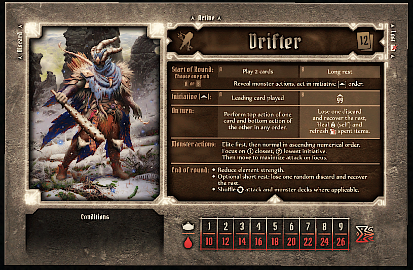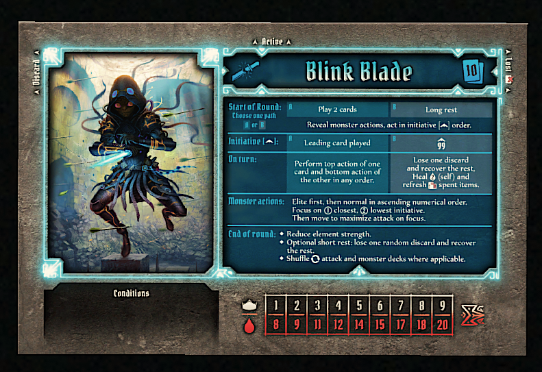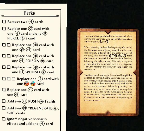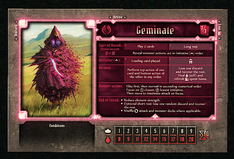 If Blinkblade was a great new type of character Frosthaven brings, Geminate is simply mind-blowing! That adventurer has two states and switches between them; each state has hand o 7 cards but common discard and lost piles. In worst case scenario you can get exhausted as you may have not enough cards in one state while full hand in the other!