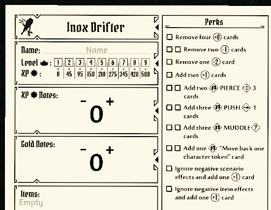 I started Gloomhaven campaign with Inox Brute so I definitely have a sentiment for that race. And while Drifter is definitely different character to play than my damage-dealing tank, it feels very close to the original adventurers. When comparing to Brute, we again have a good health but more range attacks and better stamina (12 cards). Perks are similar, although “Move back one character token” is key here as Drifter depends heavily on all those “The next XXX times you do that and that…” cards.
