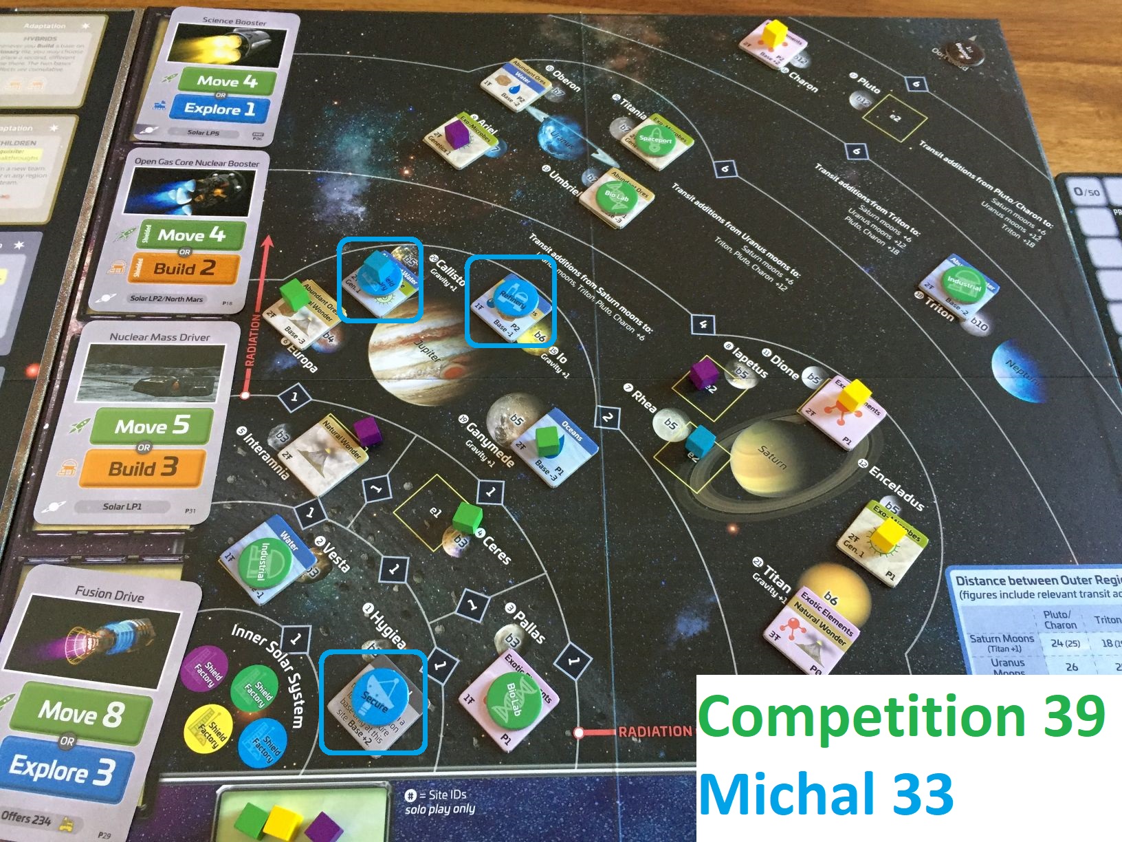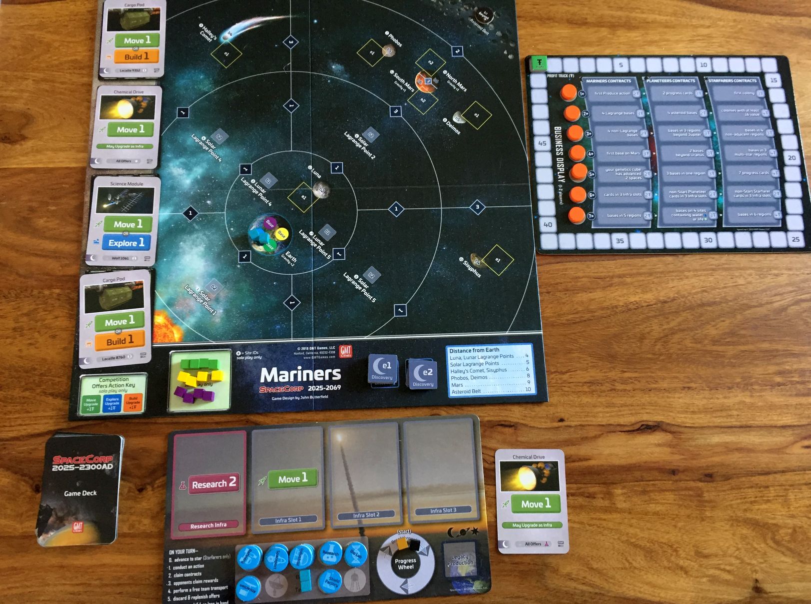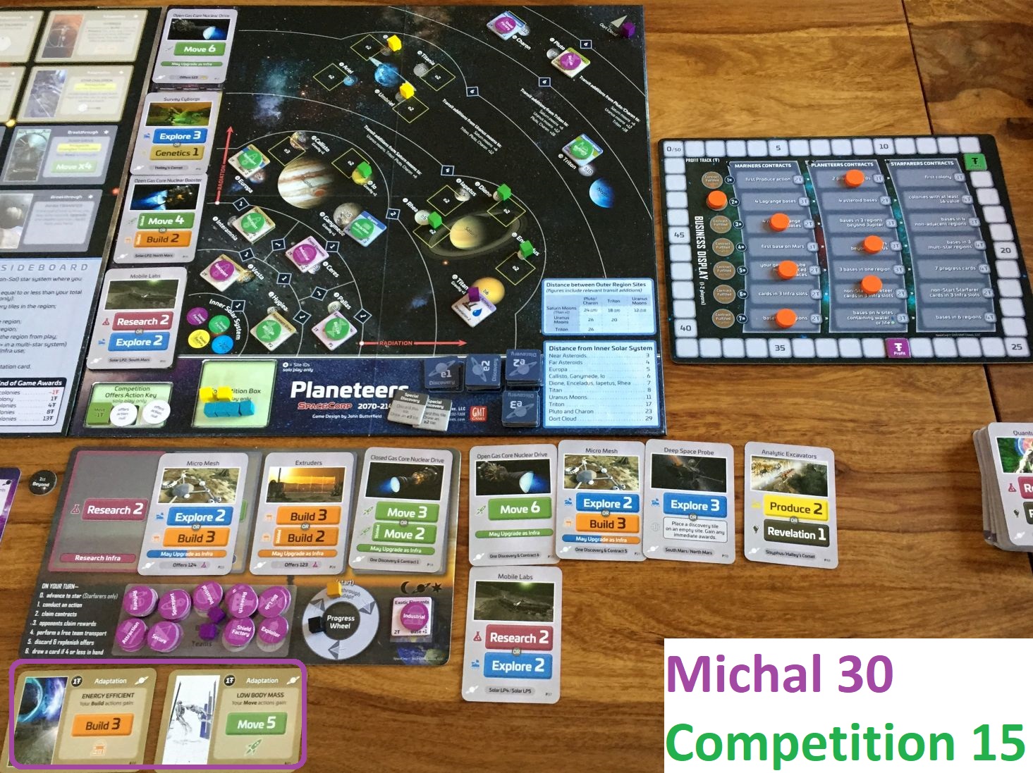 We have three eras in SpaceCorp. We start with Mariners, going as far as Mars from Earth. Set-up above (click to enlarge)My industrial base was thoroughly upgraded during this first era (click to enlarge)It was an interesting experience to play against opponent who can get points in so many ways, especially via offers. Still, with 3 bases build, I was not so much behind (click to enlarge)The second turn – Planeteers – was much more difficult. That radiation was killing me but thanks to proper adaptation I finally overcome it. Still, I moved no farther then Jupiter, but played a lot of production cards to keep up with AI (click to enlarge)Goth ya! Starfarers turn – building that adaptation to be immune to radiation and then the one which transports once your team to any system was a key to victory (click to enlarge)I managed to establish a very strong foothold in Epsilon Eridani & Tau Ceti systems, building even 2 colonies! (click to enlarge)One more close up on the game situation. With 11 points lead I managed to decisively beat the Competition (click to enlarge)